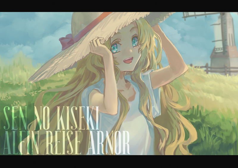 alfin_reise_arnor blonde_hair blue_eyes blue_sky character_name cloud copyright_name eiyuu_densetsu field grass hat holding holding_unworn_clothes holding_unworn_hat horizon irise_ryouji letterboxed long_hair looking_at_viewer open_mouth sen_no_kiseki_(series) sen_no_kiseki_i shirt sky straw_hat teeth unworn_hat unworn_headwear upper_teeth_only white_shirt windmill