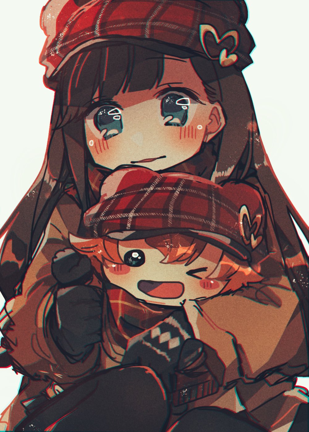 >_o 2girls :d black_mittens black_pantyhose blue_eyes blush blush_stickers brown_hair brown_jacket newsboy_cap cha_ipride hair_behind_ear hat hat_ornament heart heart_hat_ornament highres jacket long_bangs long_hair long_sleeves mittens multiple_girls one_eye_closed open_mouth original pantyhose parted_lips plaid_clothes plaid_headwear plaid_scarf red_headwear red_scarf scarf sidelocks simple_background sitting sitting_on_lap sitting_on_person smile straight_hair upper_body white_background winter_clothes