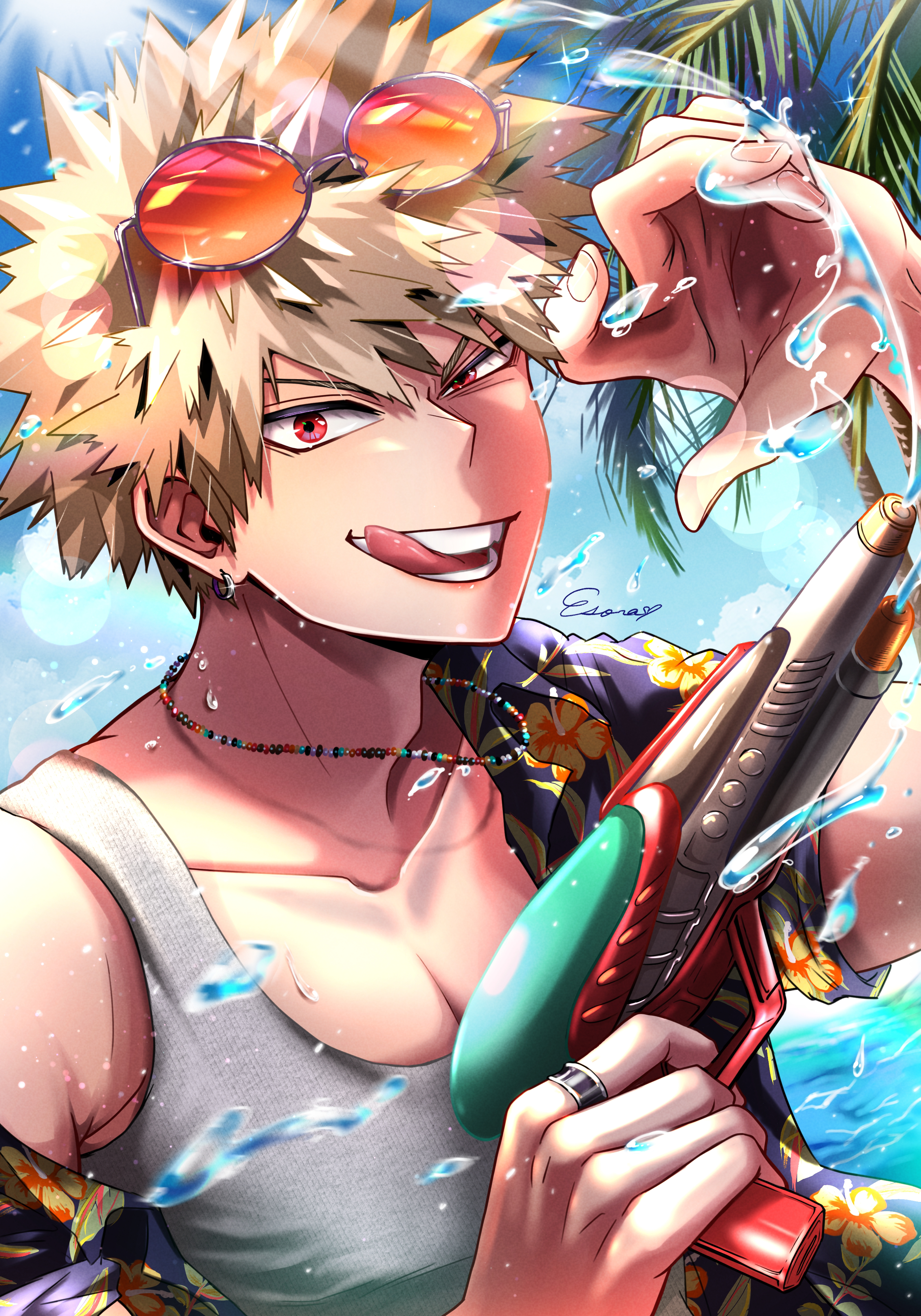 1boy absurdres bakugou_katsuki blonde_hair blue_shirt boku_no_hero_academia esora-arts eyewear_on_head floral_print glasses grey_tank_top highres holding holding_water_gun male_focus open_mouth orange-framed_eyewear red_eyes shirt short_hair smile solo spiked_hair tank_top teeth tongue tongue_out water water_gun