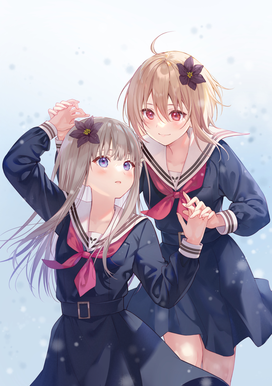 2girls ahoge arm_up black_flower black_serafuku black_shirt black_skirt blue_eyes brown_hair closed_mouth commentary_request flower fukahire_(ruinon) gradient_background grey_background hair_between_eyes hair_flower hair_ornament highres holding_hands long_hair long_sleeves multiple_girls neckerchief original parted_lips puffy_long_sleeves puffy_sleeves red_eyes red_neckerchief sailor_collar school_uniform serafuku shirt skirt smile very_long_hair white_sailor_collar yuri
