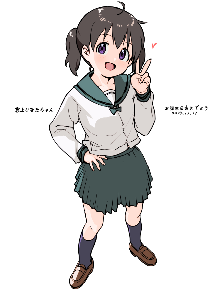 1girl 2023 black_hair blue_socks blush collarbone dated dot_nose female_focus full_body green_sailor_collar kuraue_hinata long_sleeve_shirt long_sleeves looking_at_viewer medium_hair open_mouth purple_eyes sailor_collar school_uniform serafuku shoes simple_background skirt socks solo translation_request v white_background yama_no_susume yamaaohina