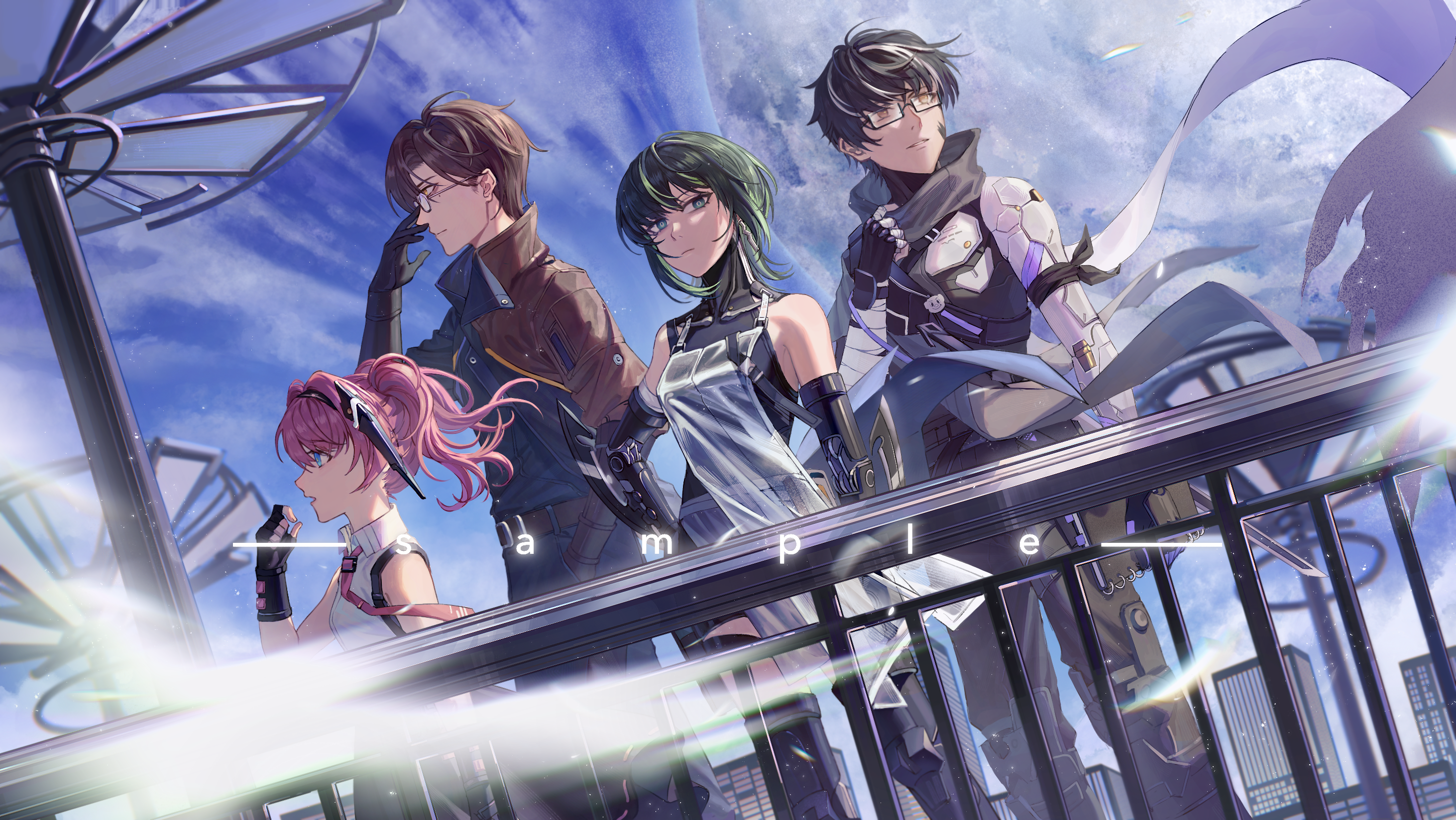 2boys 2girls adjusting_eyewear apron arm_blade badge bandaged_arm bandaged_fingers bandages bandolier bare_shoulders belt black_bodysuit black_gloves black_hair black_hairband black_skirt blue_eyes blue_sky bodysuit brown_hair button_badge chinese_commentary city cloud collared_shirt colored_inner_hair commentary cyborg dutch_angle earrings feet_out_of_frame fingerless_gloves glasses gloves green_eyes green_hair grey_scarf hair_intakes hairband hand_in_pocket hand_on_own_hip headgear highres holding holding_notebook jacket jewelry joints lamppost leather leather_jacket light_particles lillian_(pgr) lishijiu mechanical_arms mechanical_legs mole mole_under_eye multicolored_hair multiple_boys multiple_girls necktie noan_(pgr) notebook orange_eyes outdoors palma_(pgr) pink_hair pink_necktie planet profile punishing:_gray_raven railing rectangular_eyewear robot_joints sample_watermark scar scarf see-through_apron see-through_clothes shirt short_hair short_twintails simon_(pgr) single_earring single_mechanical_arm skirt sky sleeveless sleeveless_bodysuit sleeveless_shirt streaked_hair torn_clothes torn_scarf twintails watermark weapon white_shirt