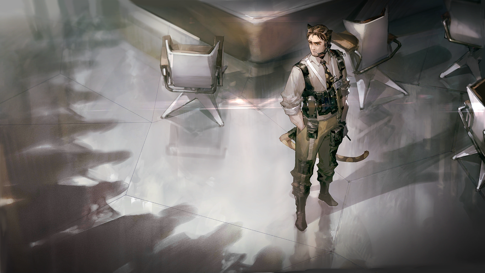 1boy 6+others animal_ears arknights artist_request boots brown_hair chair cigarette collared_shirt ferdinand_(arknights) hand_in_pocket highres holding holding_cigarette leopard_ears leopard_tail looking_at_another microphone military multiple_others necktie official_art pants polka_dot serious shirt sleeves_rolled_up solo_focus standing tail turning_head white_shirt