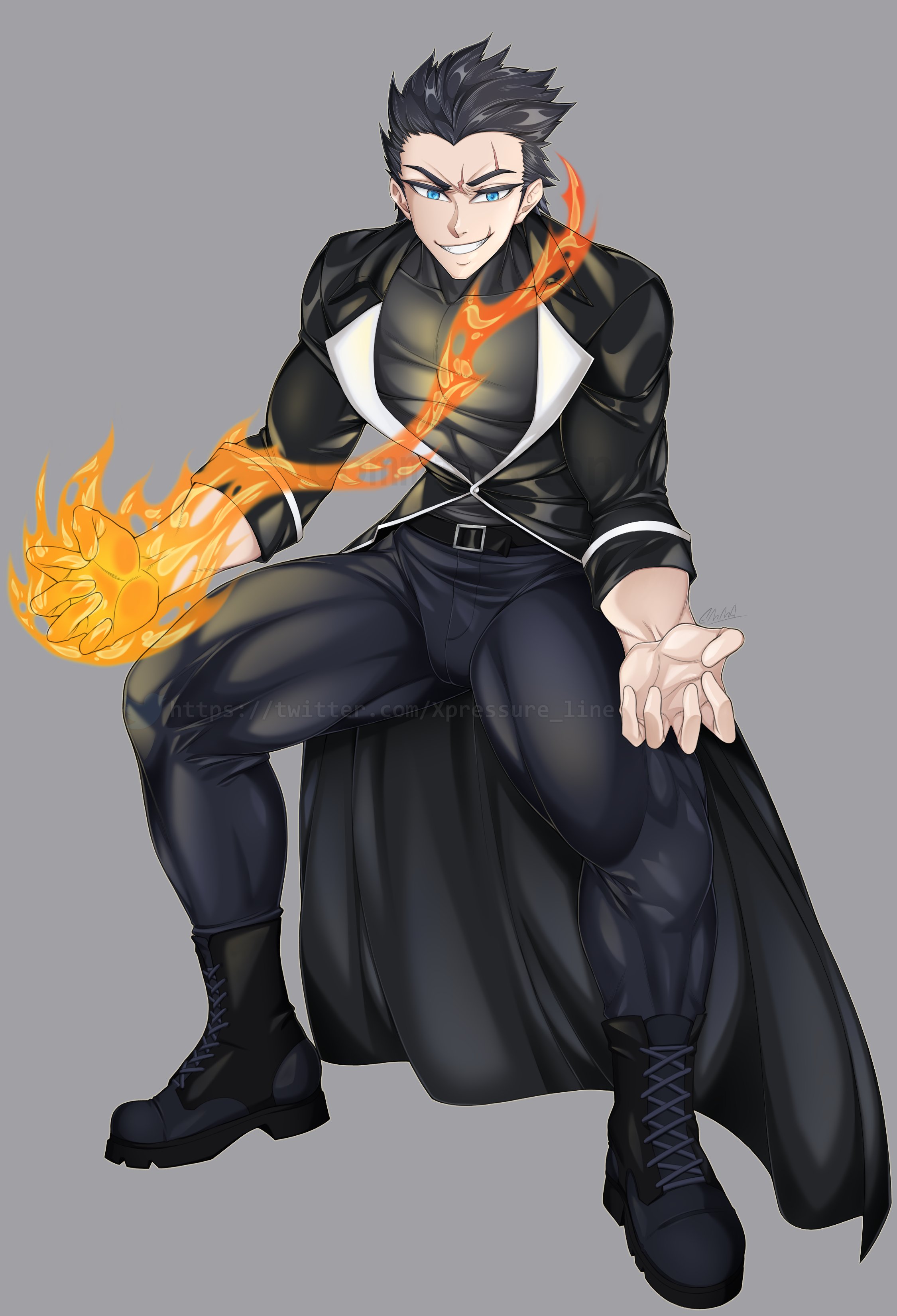 absurdres adjusting_clothes black_boots black_hair black_jacket black_pants blue_eyes boots colored_skin drawing emma_pressure fire highres jacket lace-up_boots muscular muscular_male original pants white_skin