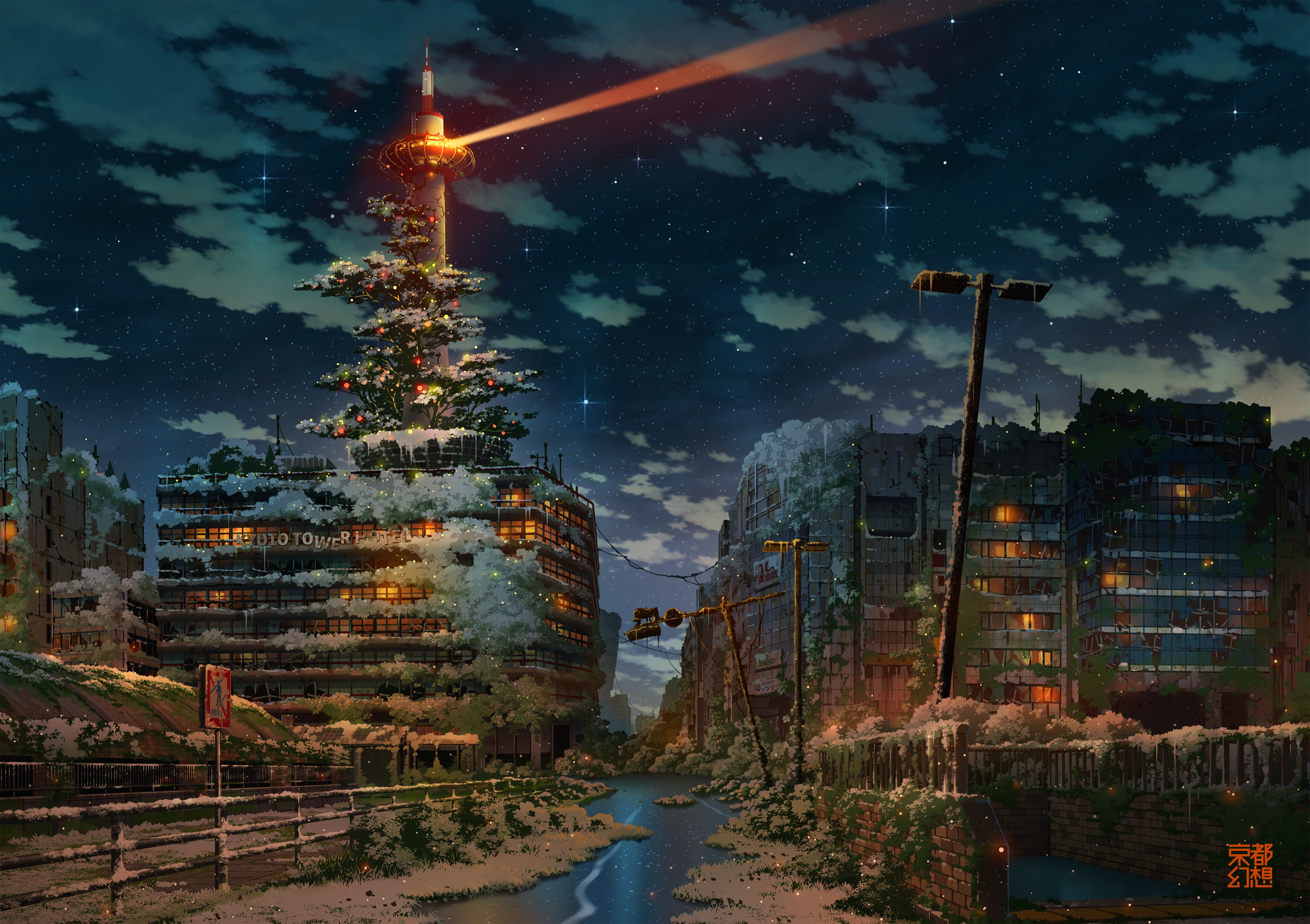 abandoned absurdres brick_wall broken_window building city cloud commentary_request dilapidated highres kyoto_tower lamppost night original outdoors overgrown post-apocalypse railing road_sign ruins scenery sign sky snow star_(sky) starry_sky tokyogenso water