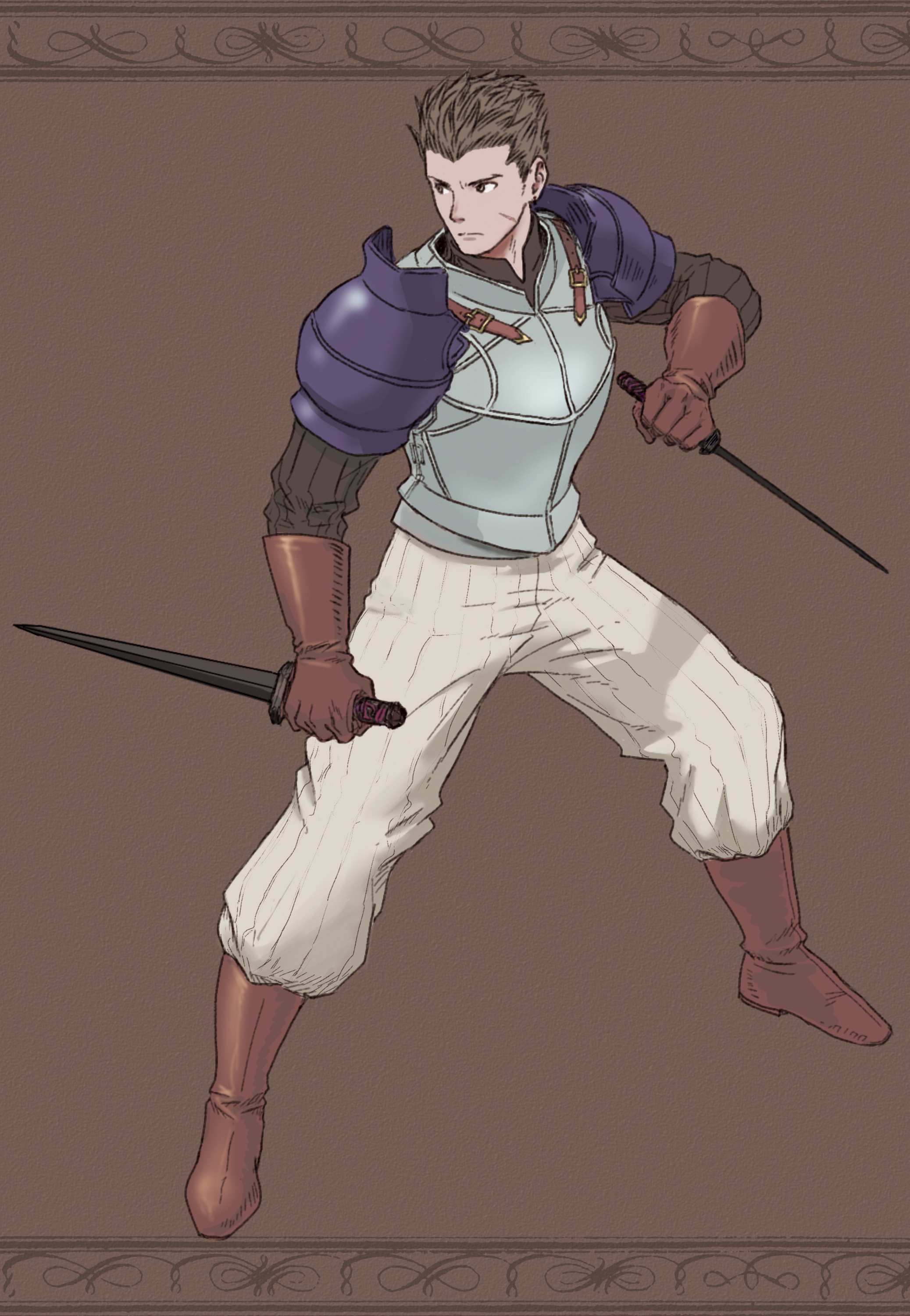 1boy absurdres armor boots brown_background brown_boots brown_gloves brown_hair dual_wielding facial_scar fighting_stance full_body gloves highres holding male_focus scar scar_on_cheek scar_on_face short_hair solo standing tactics_ogre vice_bozeg windcaller
