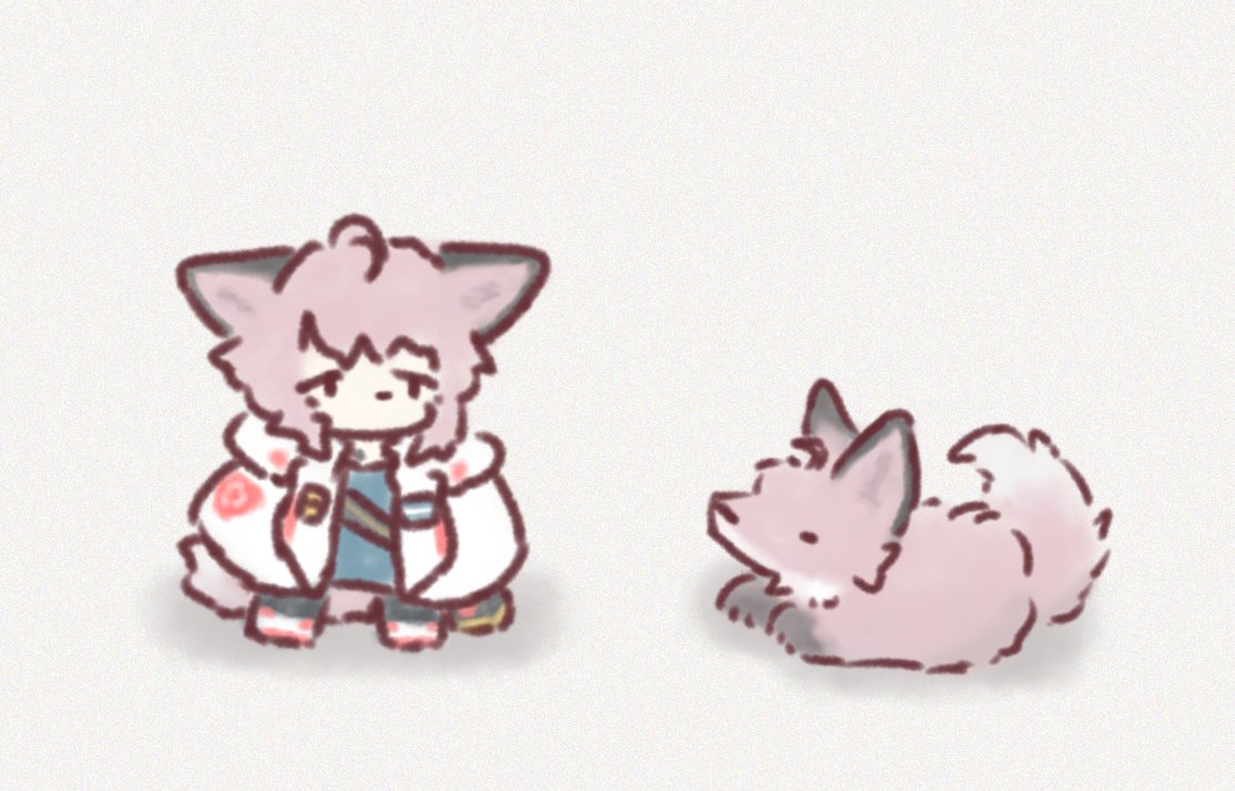 1girl animal_ears animalization arknights chibi commentary dr_luyan fox fox_ears fox_girl fox_tail pink_fur pink_hair simple_background sussurro_(arknights) untranslatable_commentary tail white_background