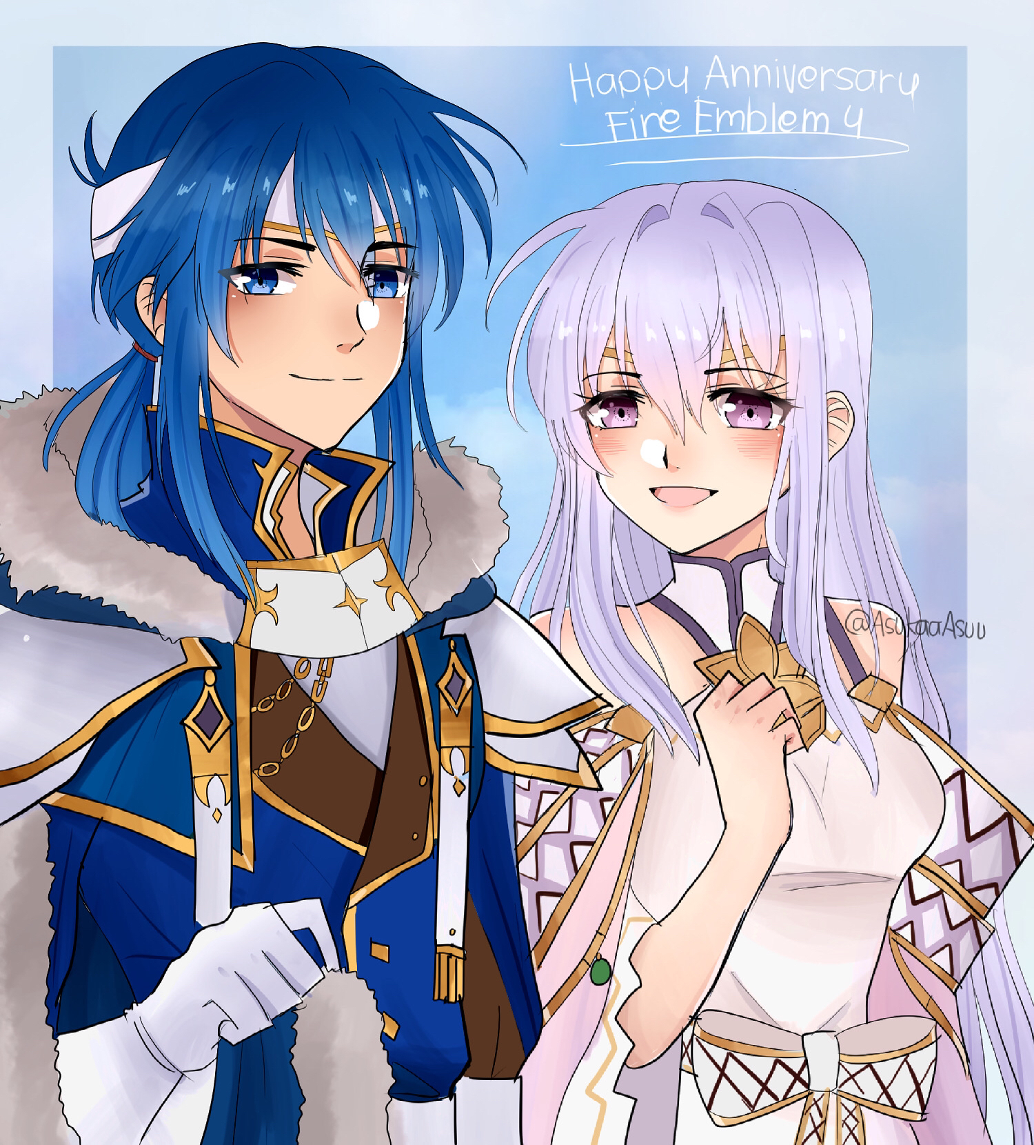 anniversary asukaaasuu blue_eyes blue_hair blush brother_and_sister circlet dress fire_emblem fire_emblem:_genealogy_of_the_holy_war gloves hand_up headband highres julia_(crusader_of_light)_(fire_emblem) julia_(fire_emblem) long_hair looking_at_viewer nintendo open_mouth ponytail purple_eyes purple_hair seliph_(fire_emblem) seliph_(scion_of_light)_(fire_emblem) siblings simple_background white_headband