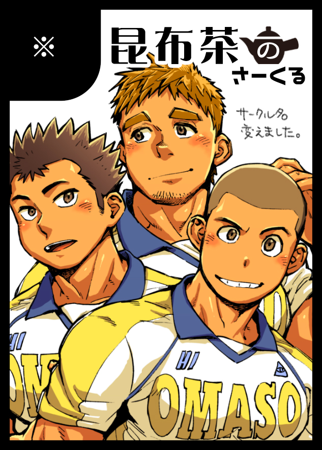3boys autumn_yarofes:2023 bara blush buzz_cut dark-skinned_male dark_skin facial_hair goatee_stubble huge_eyebrows kobucha large_pectorals light_brown_hair looking_at_viewer male_focus multiple_boys muscular muscular_male original pectorals promotional_art raised_eyebrow rugby_uniform short_hair sideburns sideburns_stubble smirk spiked_hair sportswear stubble thick_eyebrows translation_request uneven_eyes upper_body very_short_hair