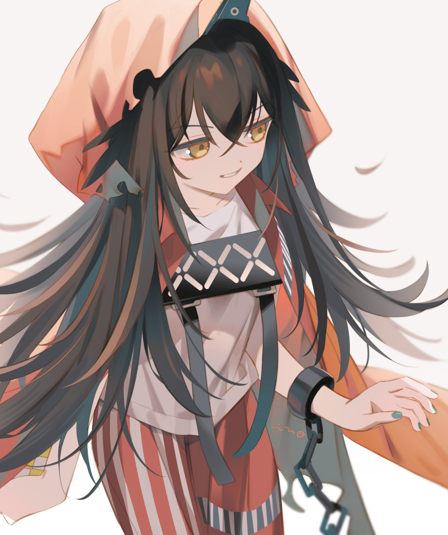 1girl aqua_nails arknights brown_hair cowboy_shot cuffs hair_between_eyes hand_up hood hood_up hooded_jacket inogashi jacket jacket_on_shoulders kafka_(arknights) long_hair orange_jacket pants red_pants shackles shirt simple_background smile solo very_long_hair white_background white_shirt yellow_eyes