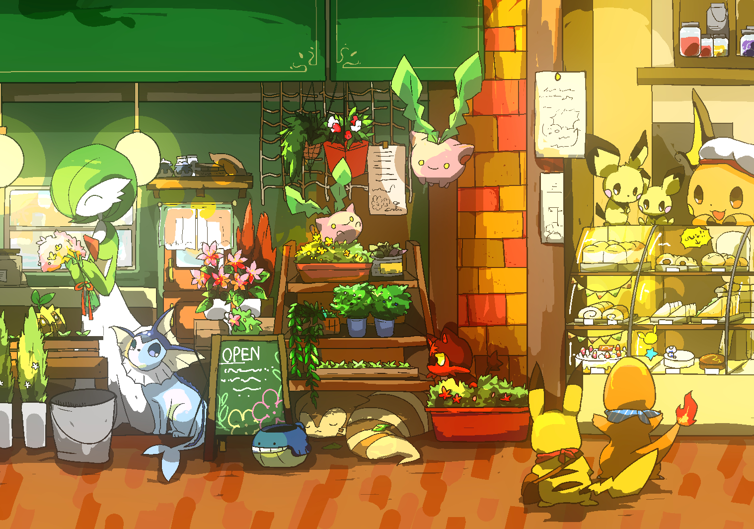 ^_^ bakery bouquet bread bucket cake chalkboard_sign charmander closed_eyes flower flying food from_behind furret gardevoir gen_1_pokemon gen_2_pokemon gen_3_pokemon gen_7_pokemon hoppip jam kura_(shironagasu02) litten looking_at_another lying market nintendo no_humans outdoors paper pastry pichu pikachu plant pokemon potted_plant raichu red_flower sandwiched shop sign simple_flower sitting sleeping smile standing sunflora vaporeon wailord