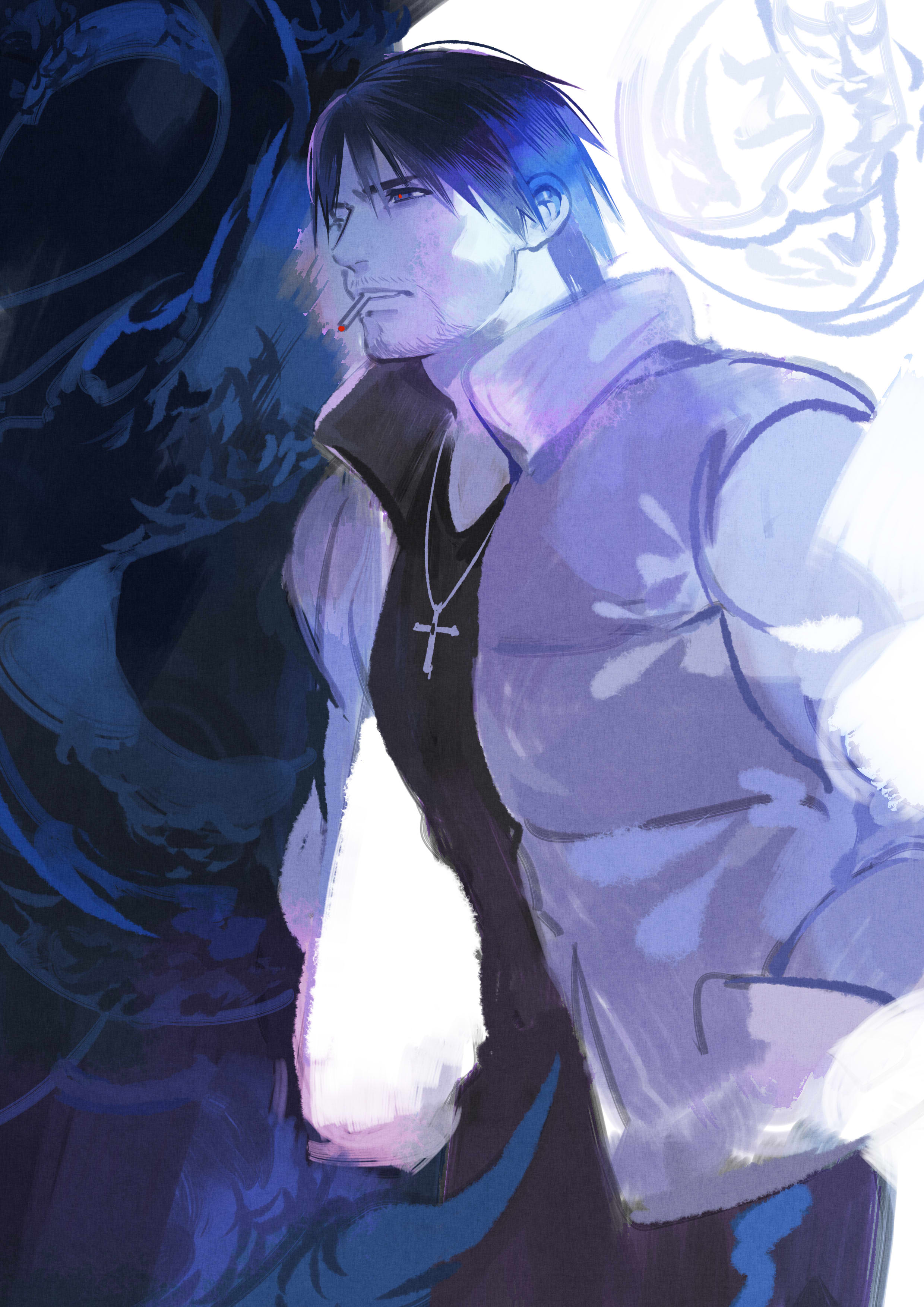 1boy absurdres beard_stubble black_background black_eyes black_pants black_shirt blue_hair blue_theme cigarette cross cross_necklace dojima_daigo facial_hair hands_in_pockets highres jacket jewelry kuromonoka male_focus mouth_hold necklace pants profile ryuu_ga_gotoku_(series) ryuu_ga_gotoku_2 shirt short_hair solo stubble two-tone_background white_background white_jacket