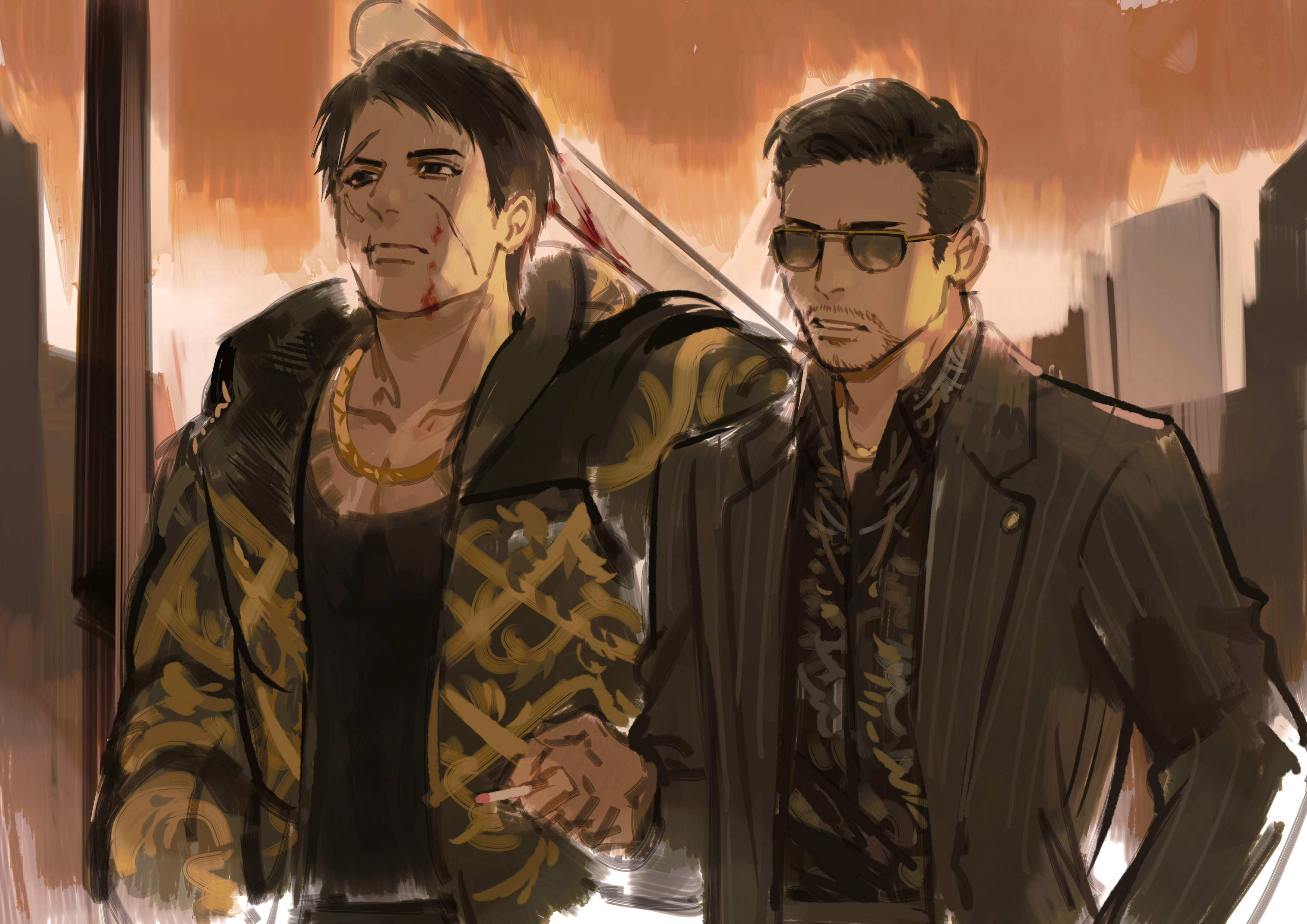 2boys absurdres baseball_bat beard_stubble black_eyes black_hair black_jacket black_shirt blood blood_on_face chain cigarette closed_mouth collared_shirt cowboy_shot facial_hair gold_chain highres holding holding_cigarette jacket kuromonoka long_sleeves male_focus metal_baseball_bat multiple_boys parted_lips ryuu_ga_gotoku_(series) ryuu_ga_gotoku_7_gaiden scar scar_on_face scar_on_lip shirt shishido_kousei short_hair standing stubble sunglasses tsuruno_yuki yellow_jacket