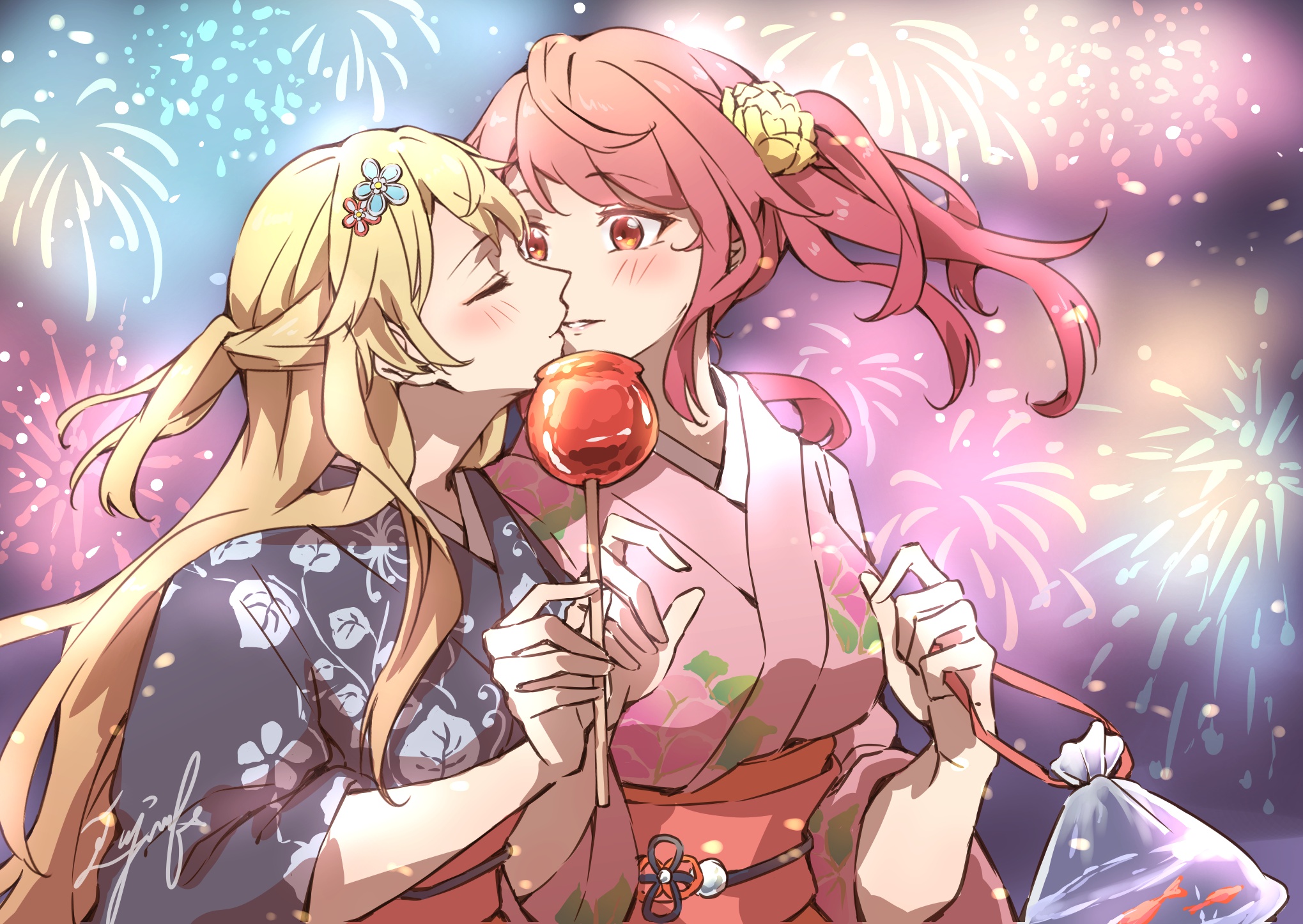 2girls aerial_fireworks aiiro_bokujuu bag bang_dream! bang_dream!_girls_band_party! black_kimono blonde_hair blush candy candy_apple fireworks fish floral_print floral_print_kimono flower food goldfish hair_flower hair_ornament hairclip highres holding holding_bag holding_candy holding_candy_apple holding_food imminent_kiss japanese_clothes kimono long_hair maruyama_aya multiple_girls orange_eyes pink_hair print_kimono shirasagi_chisato side_ponytail summer_festival yuri