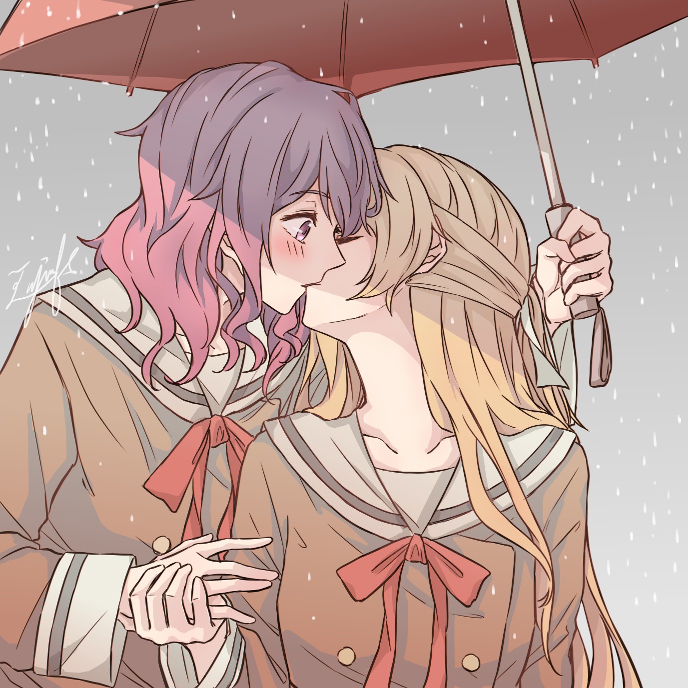 2girls aiiro_bokujuu bang_dream! bang_dream!_girls_band_party! blonde_hair brown_shirt closed_eyes hand_grab highres holding holding_umbrella kiss long_hair long_sleeves looking_at_another maruyama_aya multiple_girls neck_ribbon pink_hair purple_eyes red_ribbon red_umbrella ribbon sailor_collar school_uniform shared_umbrella shirasagi_chisato shirt umbrella white_sailor_collar yuri