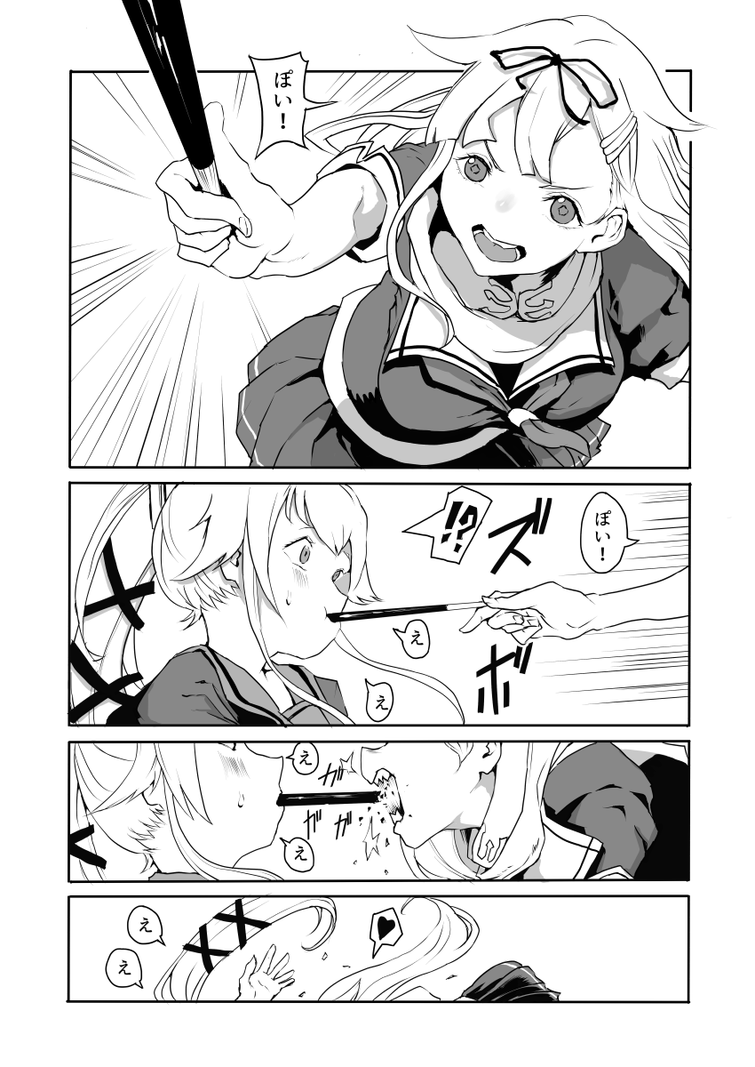 2girls biting eating food hair_flaps hair_ribbon highres kantai_collection long_hair monochrome mouth_hold multiple_girls n-mori pocky pocky_day pocky_kiss poi_(phrase) ribbon scarf school_uniform serafuku shared_food yura_(kancolle) yura_kai_ni_(kancolle) yuudachi_(kancolle) yuudachi_kai_ni_(kancolle)