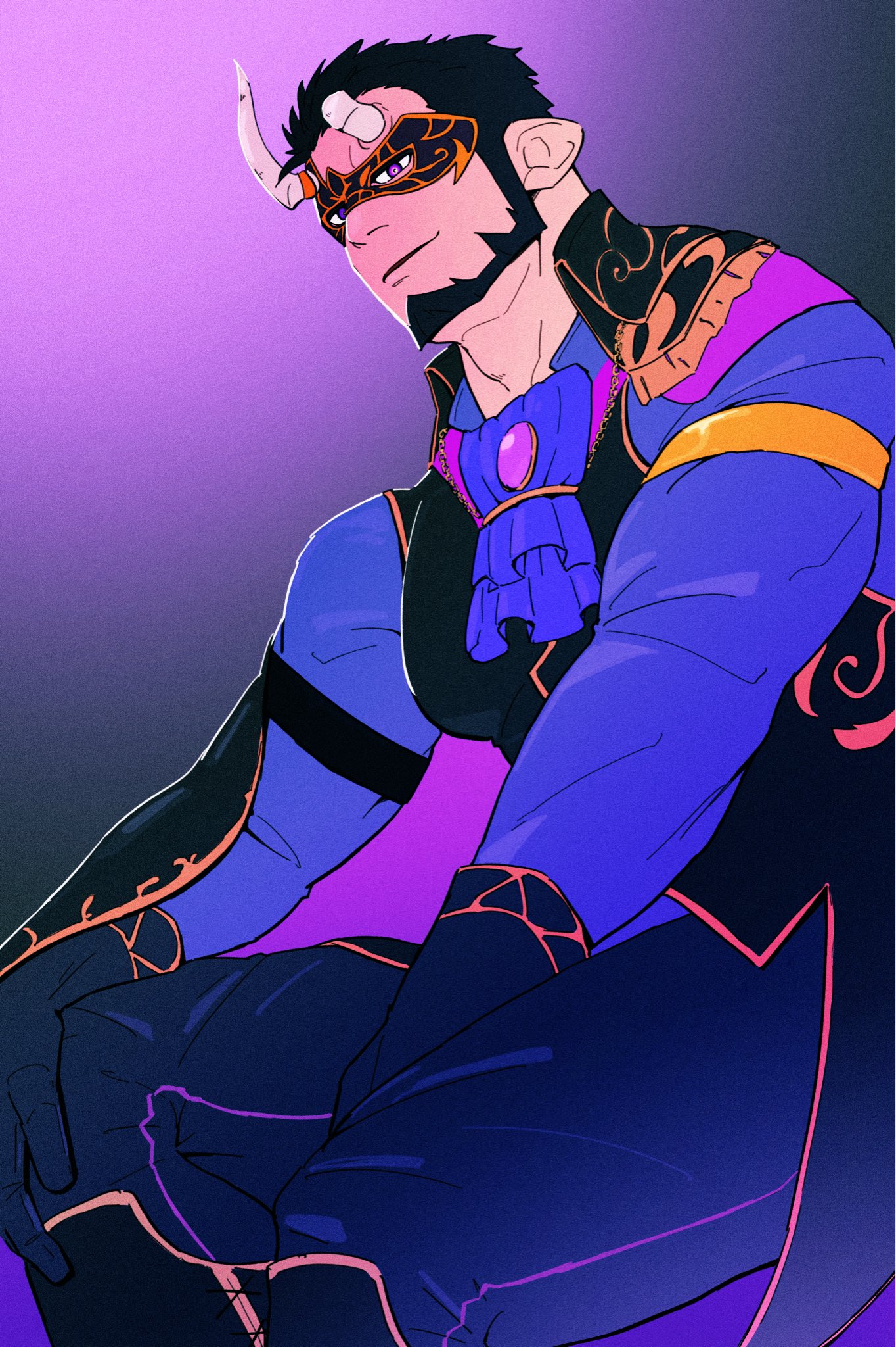 1boy adam's_apple ascot bara beard boots broken_horn demon_boy demon_horns eye_mask facial_hair feet_out_of_frame from_below halloween_costume head_tilt highres horns kansuke_(kansuke_717) large_pectorals live_a_hero looking_at_viewer male_focus mask mature_male muscular muscular_male nessen_(live_a_hero) official_alternate_costume pectorals seductive_smile short_hair sitting smile solo