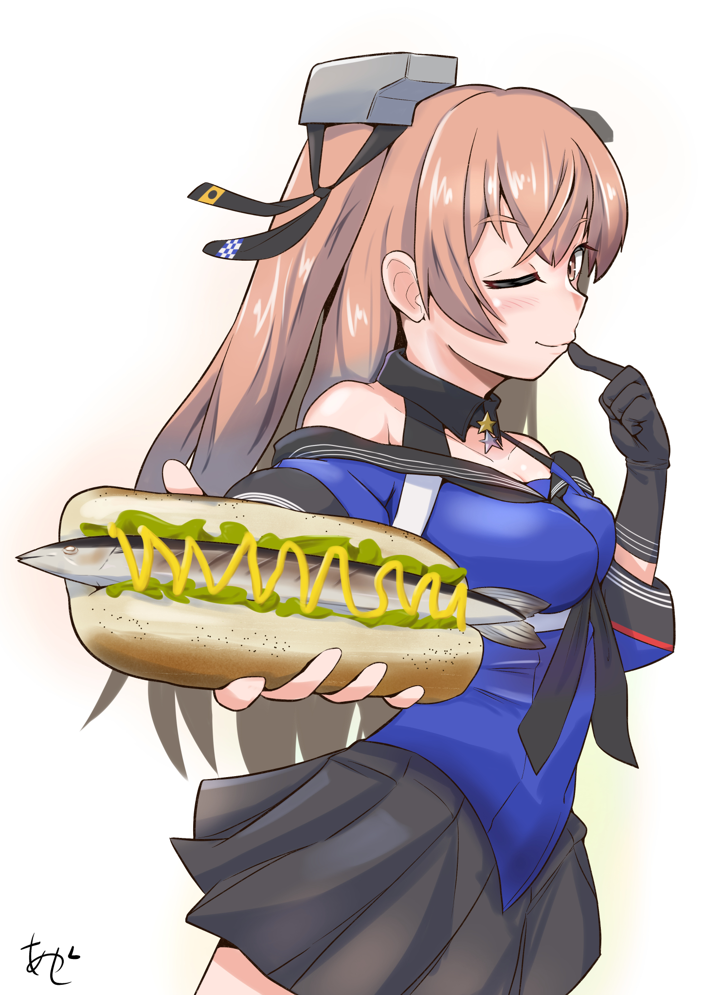 1girl akashieru black_gloves black_sailor_collar black_skirt blue_shirt breasts brown_eyes cleavage crimes_against_food fish fish_(food) gloves highres hot_dog_bun johnston_(kancolle) kantai_collection light_brown_hair long_hair medium_breasts mustard off_shoulder one-hour_drawing_challenge one_eye_closed pleated_skirt sailor_collar saury school_uniform serafuku shirt single_glove skirt solo two_side_up white_background