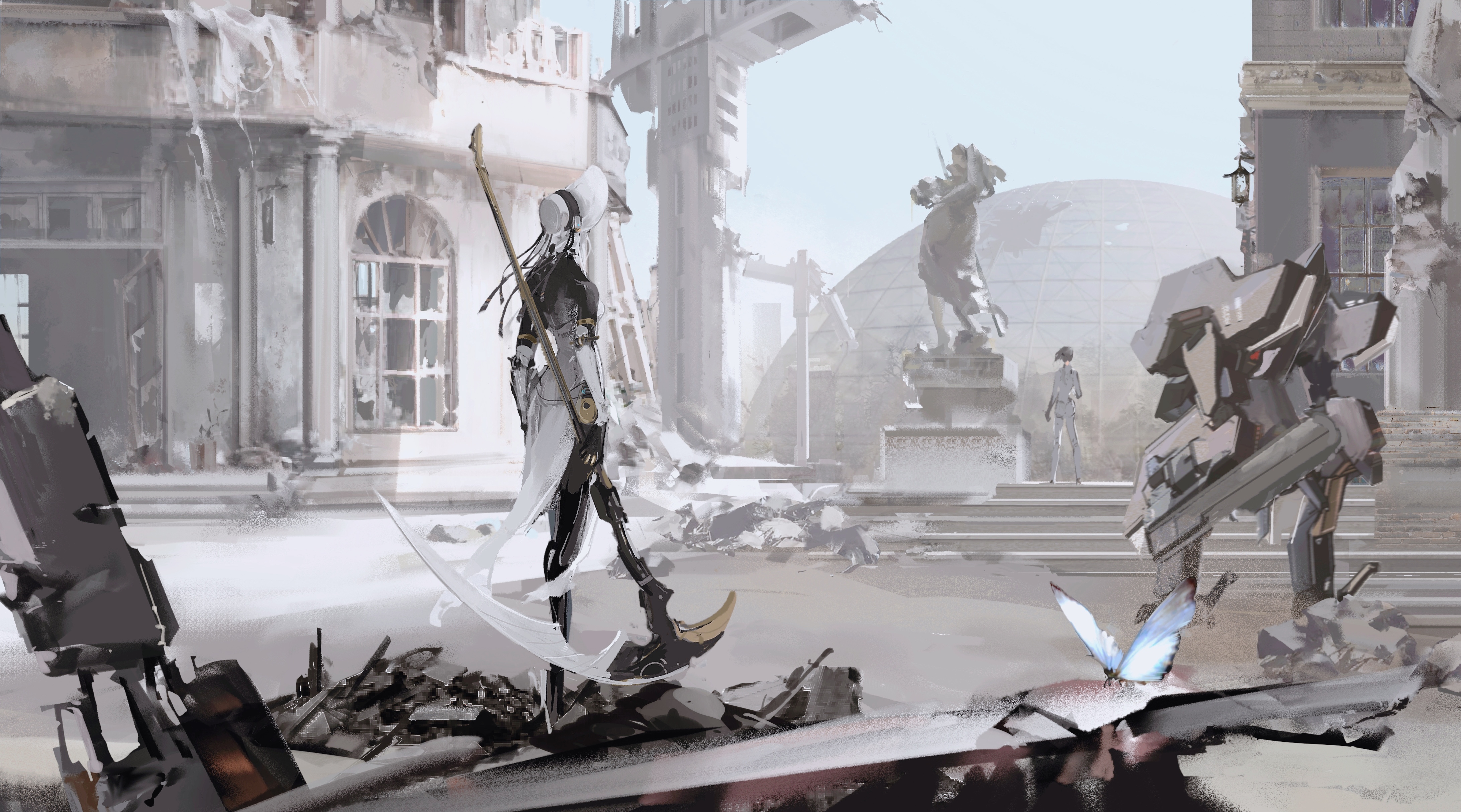 2girls absurdres acid_(t566cs7a) back billboard blue_butterfly bodysuit bonnet broken_statue broken_window bug butterfly cable chainsword city colored_skin dome dress european_architecture grey_hair haicma:_starveil_(pgr) haicma_(pgr) haicma_(punishing:_gray_raven) hanging_lantern highres holding holding_scythe holding_weapon huge_weapon insect joints mecha mechanical_arms mechanical_legs multiple_girls nanami:_starfarer_(pgr) nanami_(pgr) on_stairs pillar pilot_suit power_(pgr) punishing:_gray_raven robot robot_joints rubble ruins scythe side_slit stairs statue strapless strapless_dress weapon white_bodysuit white_dress white_hair white_headwear