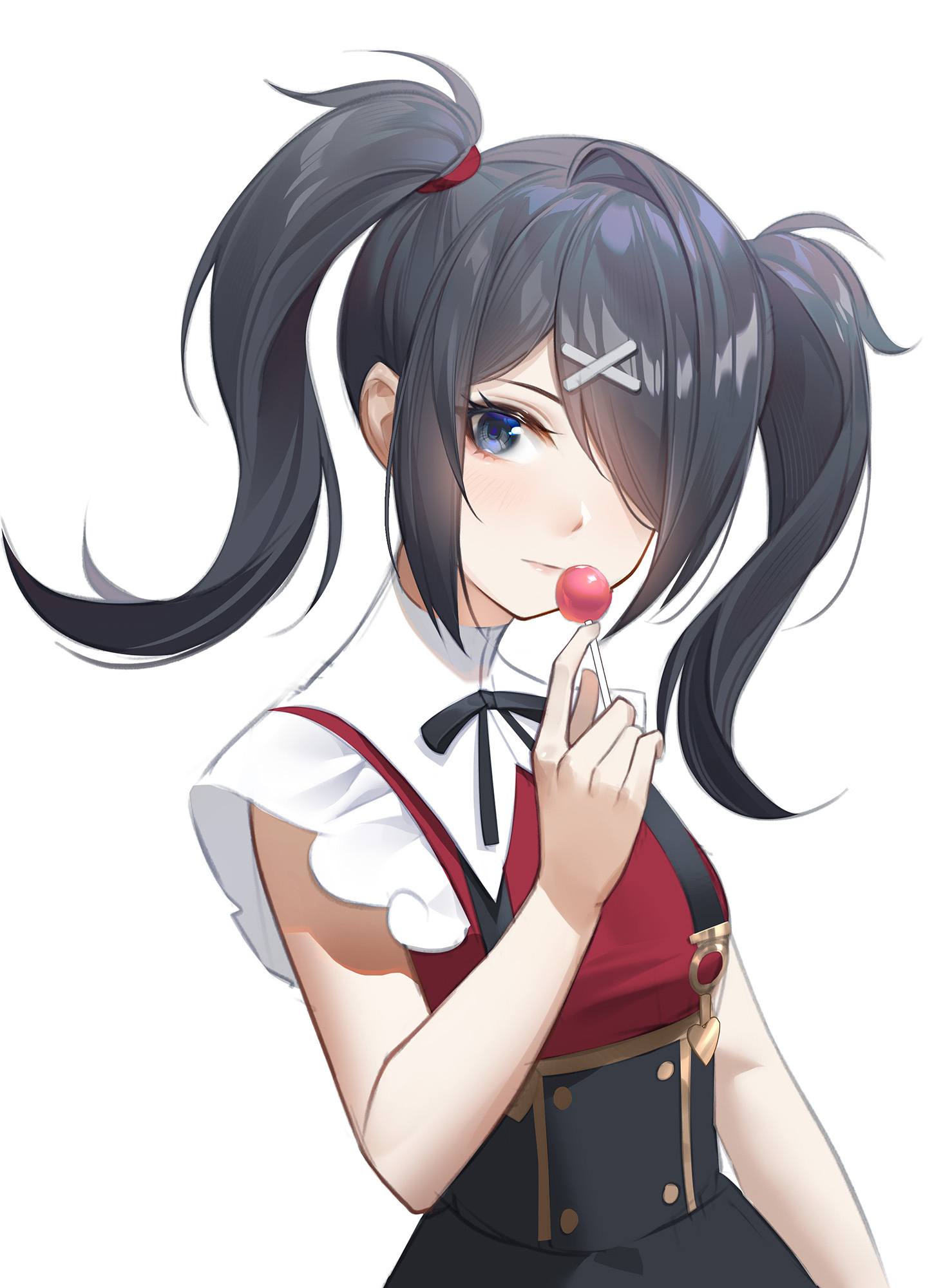 1girl ame-chan_(needy_girl_overdose) black_hair black_ribbon black_skirt blue_eyes blush candy closed_mouth collared_shirt commentary english_commentary food hair_ornament hair_over_one_eye hair_tie hairpin hand_up heart highres lollipop long_hair looking_at_viewer neck_ribbon needy_girl_overdose one_eye_covered pale_skin red_shirt ribbon shirt short_hair short_sleeves simple_background skirt solo suspender_skirt suspenders twintails white_background x_hair_ornament yaxiya
