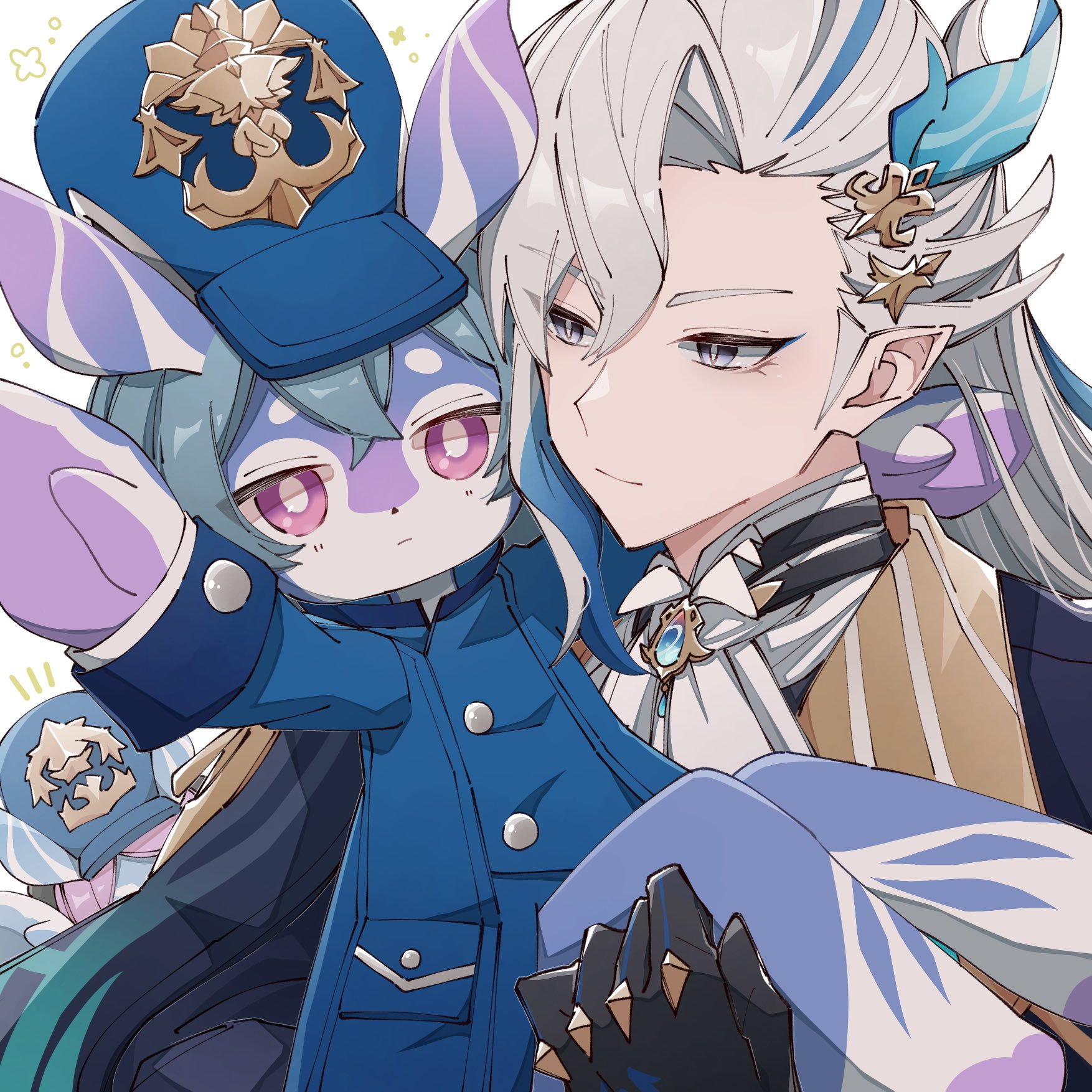 1boy 2girls arm_up ascot asymmetrical_bangs black_gloves blue_coat blue_eyeliner blue_gem blue_hair blue_headwear bright_pupils brooch buttons carrying closed_mouth coat commentary_request crossed_bangs expressionless eyeliner gem genshin_impact gloves grey_hair hair_between_eyes hair_ornament hat highres jewelry jifu_(gifu_7) long_hair long_sleeves looking_at_another makeup melusine_(genshin_impact) menthe_(genshin_impact) muirne_(genshin_impact) multicolored_hair multiple_girls neuvillette_(genshin_impact) notice_lines parted_bangs peaked_cap pink_hair pointy_ears princess_carry purple_eyes reaching reaching_towards_viewer short_hair simple_background streaked_hair upper_body white_ascot white_background white_hair white_pupils