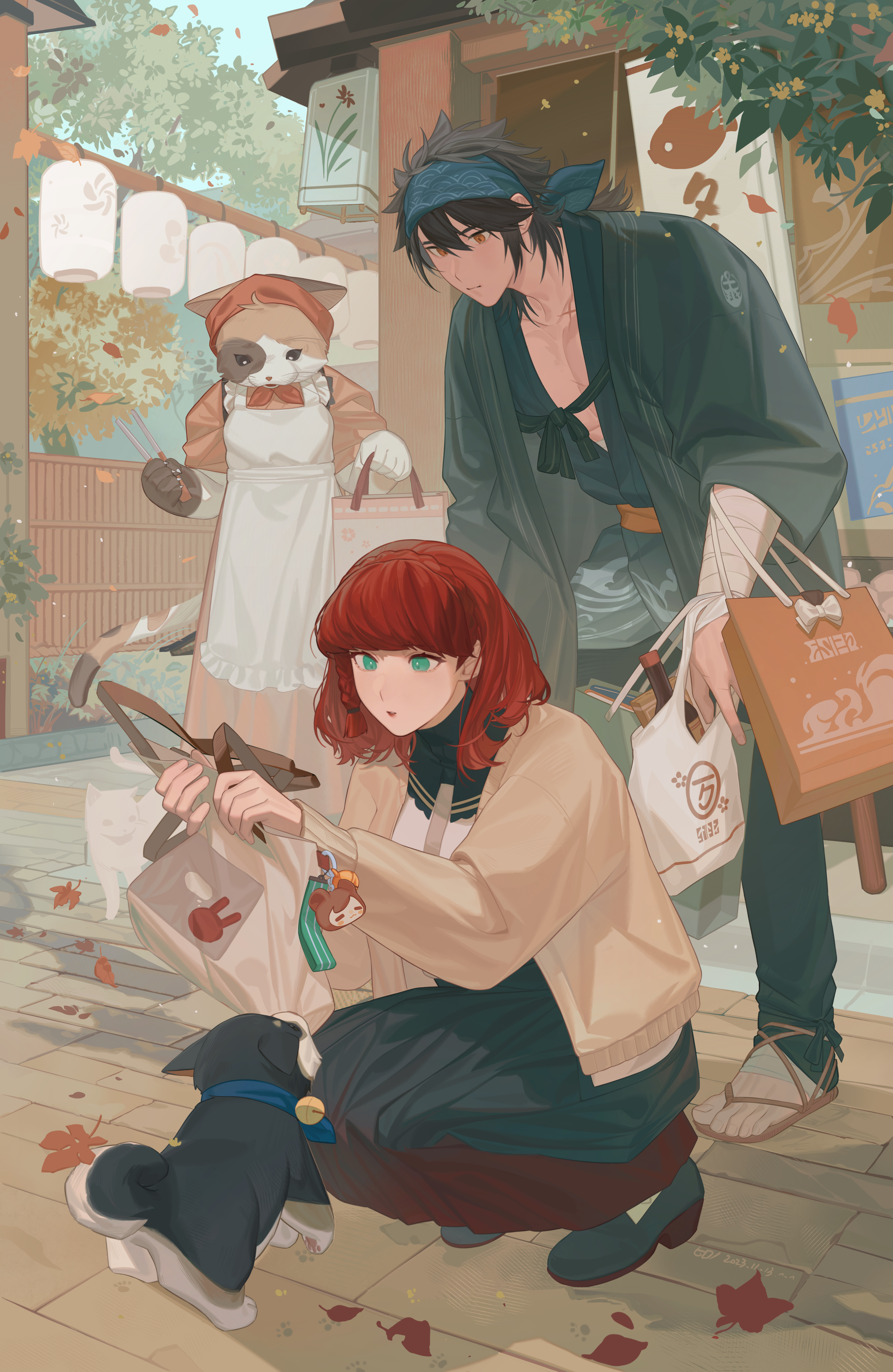 1boy 1girl 1other absurdres architecture autumn_leaves bag bandana black_hair braid cardigan cat dog east_asian_architecture falling_leaves female_saniwa_(touken_ranbu) full_body green_eyes highres hirono1118 holding holding_bag japanese_clothes lantern leaf looking_at_another medium_hair mutsu-no-kami_yoshiyuki open_cardigan open_clothes outdoors paper_lantern pectorals red_hair sandals saniwa_(touken_ranbu) shadow shiba_inu shopping_bag short_hair side_braid squatting standing touken_ranbu tree yellow_eyes zouri