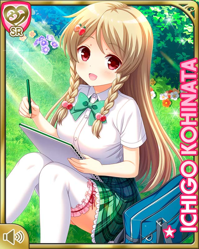 1girl :d blonde_hair bow bowtie breasts bucket card character_name day girlfriend_(kari) green_bow green_skirt hair_ornament hairclip kohinata_ichigo large_breasts lawn long_hair medium_breasts notepad official_art open_mouth outdoors plaid_clothes plaid_skirt qp:flapper red_eyes school_uniform shirt sitting skirt smile tagme thighhighs white_shirt white_thighhighs