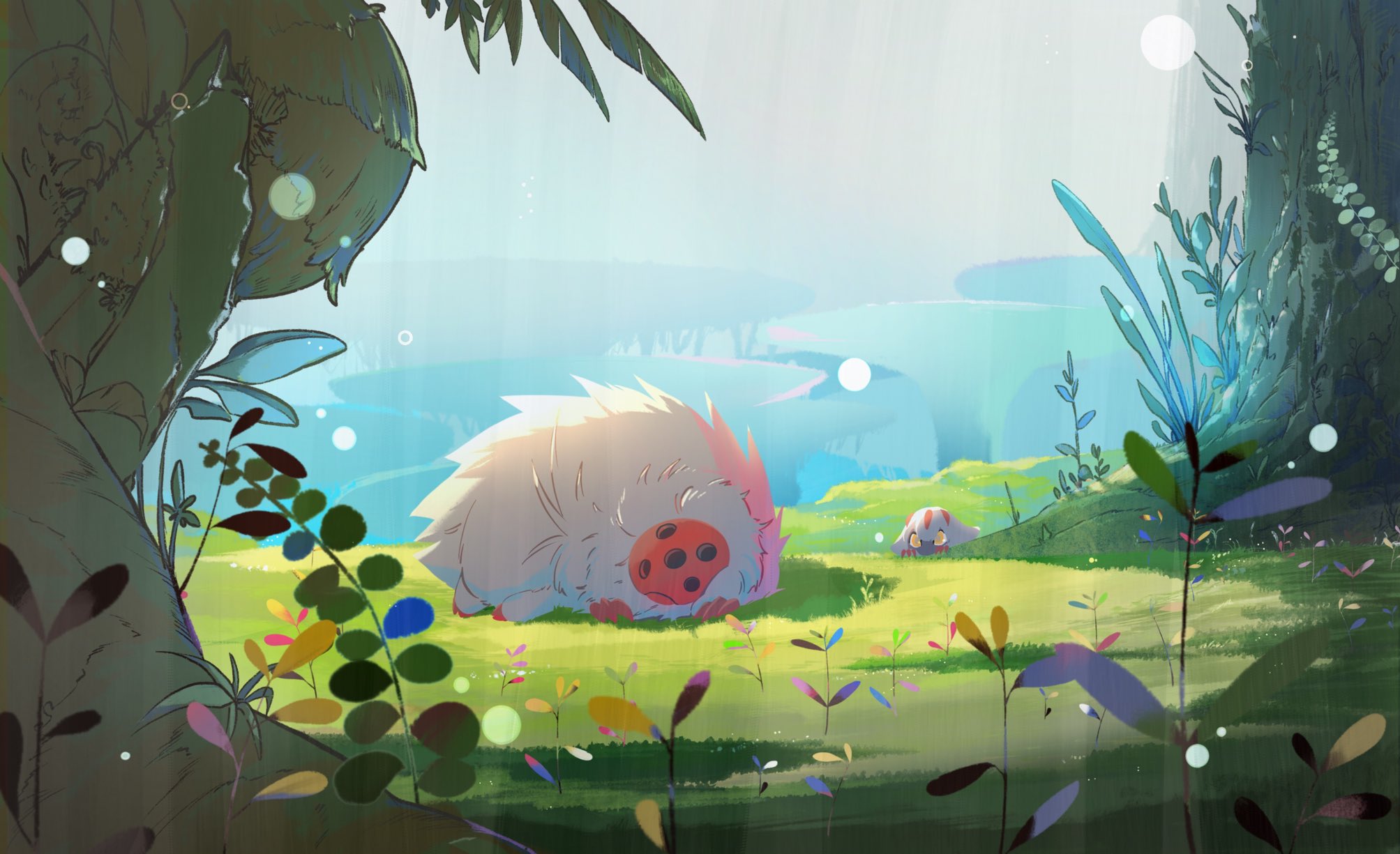 1girl animal_ears bad_id bad_twitter_id claws commentary dark-skinned_female dark_skin day faputa fewer_digits grass highres hitosoroi made_in_abyss monster nature on_ground outdoors peeking_out plant sleeping solo tamaugachi tree white_hair wide_shot yellow_eyes