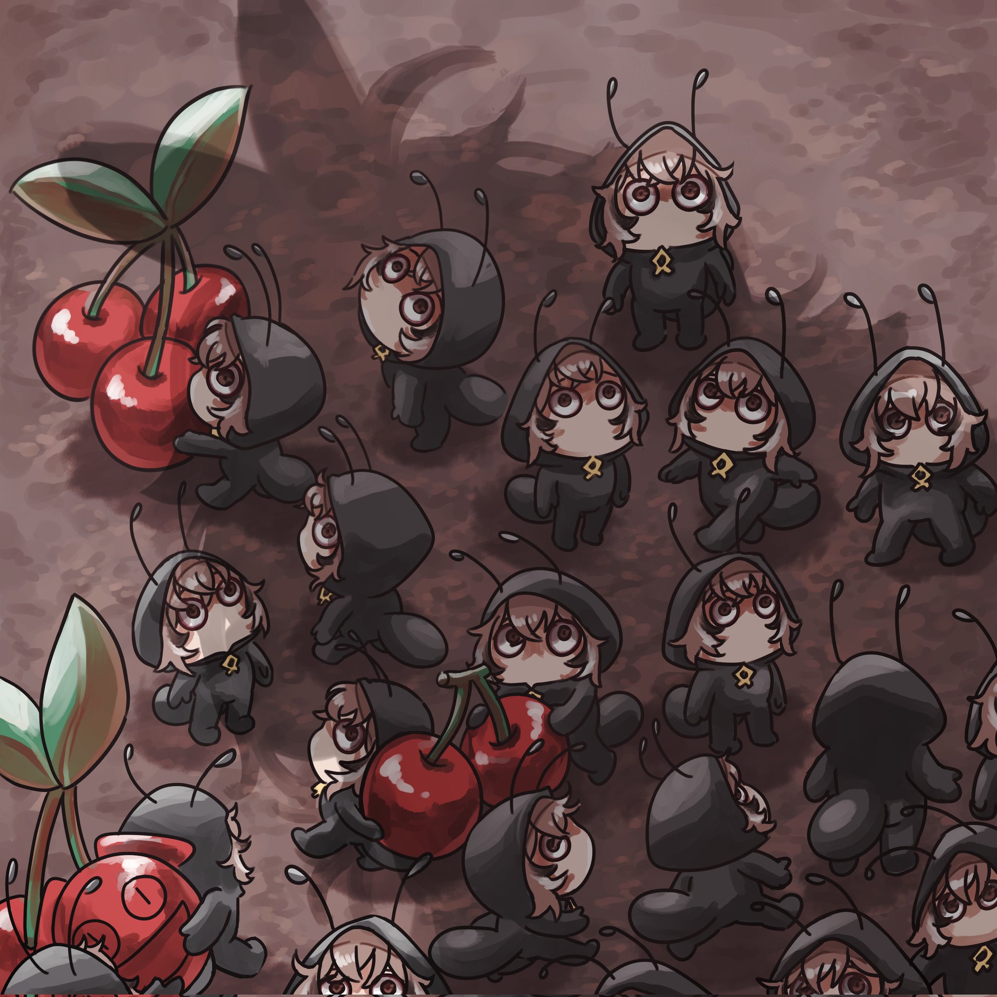 6+girls ant ant_costume antennae berry black_eyes brown_eyes brown_hair bug clone crossed_bangs dirt feathers gaecho_123 highres hololive hololive_english insect looking_up mini_person minigirl multicolored_hair multiple_girls nanashi_mumei shadow streaked_hair virtual_youtuber