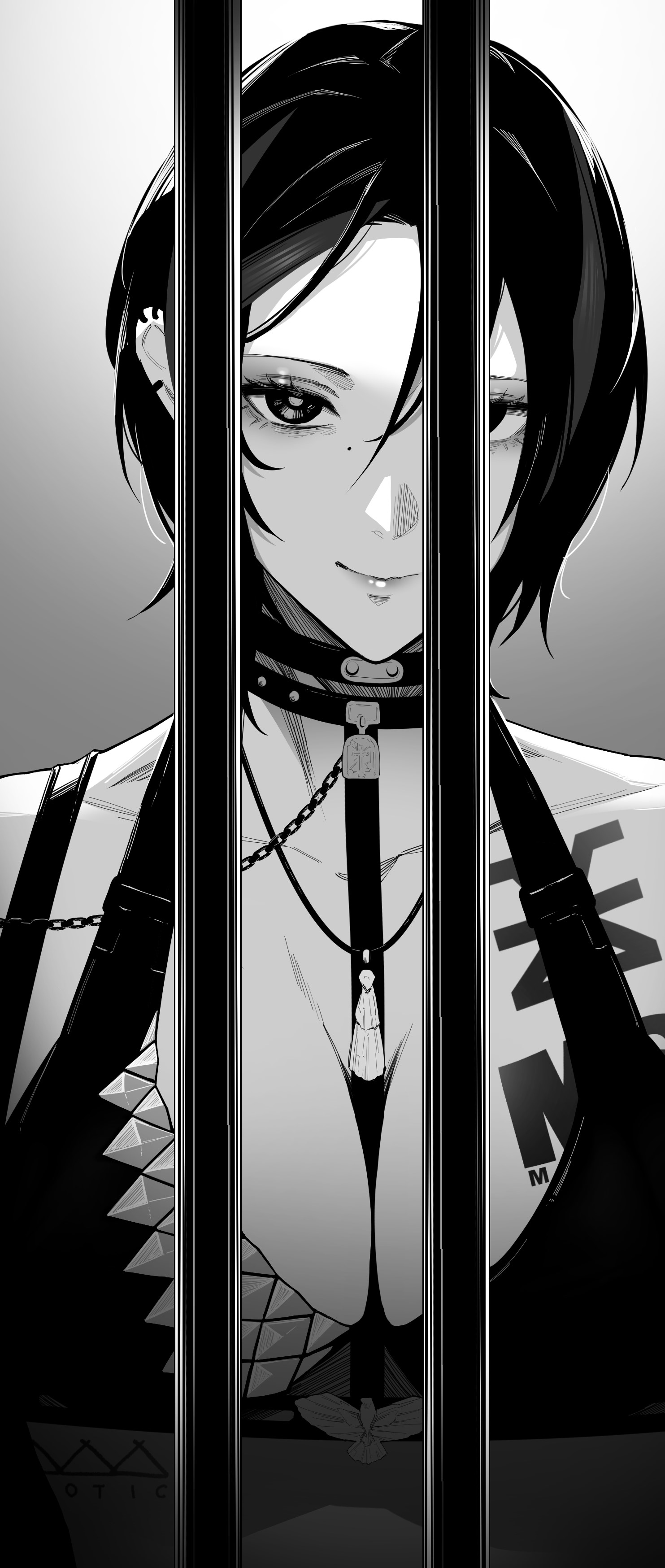 absurdres black_bra black_hair bra chain chest_tattoo collar commentary_request crow_(nikke) earrings furo_atsushi goddess_of_victory:_nikke greyscale highres iron_bars jewelry light_smile looking_at_viewer monochrome short_hair tattoo underwear