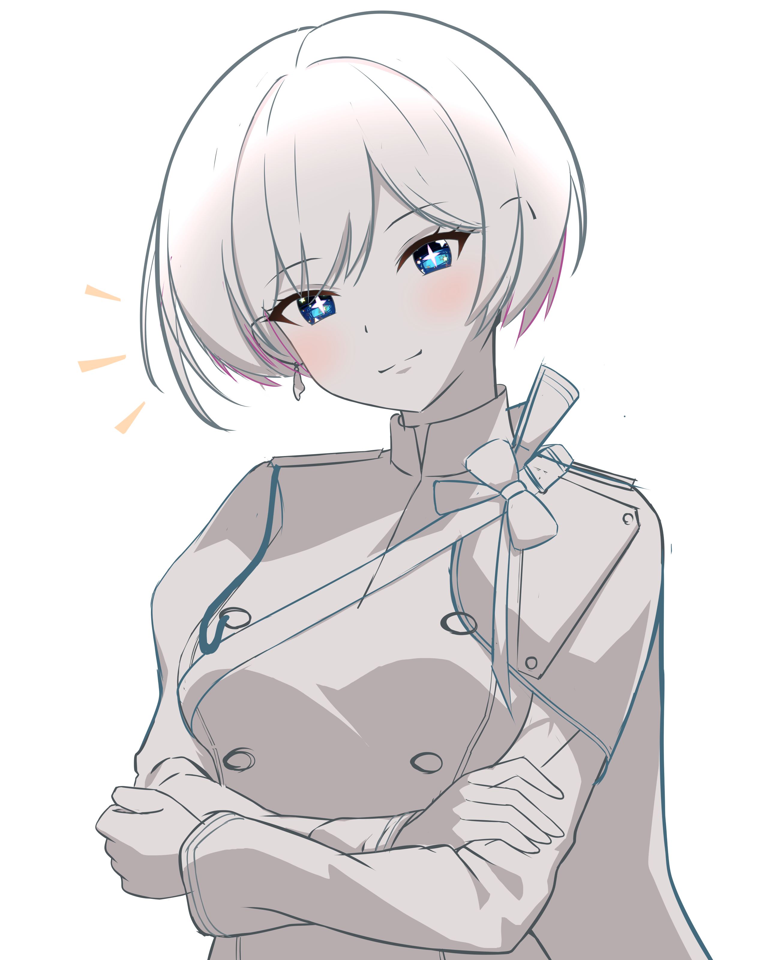 +_+ 1girl absurdres arms_under_breasts blue_eyes breasts cape closed_mouth colored_inner_hair crossed_arms dress earrings gloves goddess_of_victory:_nikke highres jewelry light_blush liliweiss_(nikke) looking_at_viewer medium_breasts military_uniform monochrome multicolored_hair pink_hair short_hair simple_background smile solo spot_color star-shaped_pupils star_(symbol) symbol-shaped_pupils white_background white_hair yuyuchi_(gyazaa)