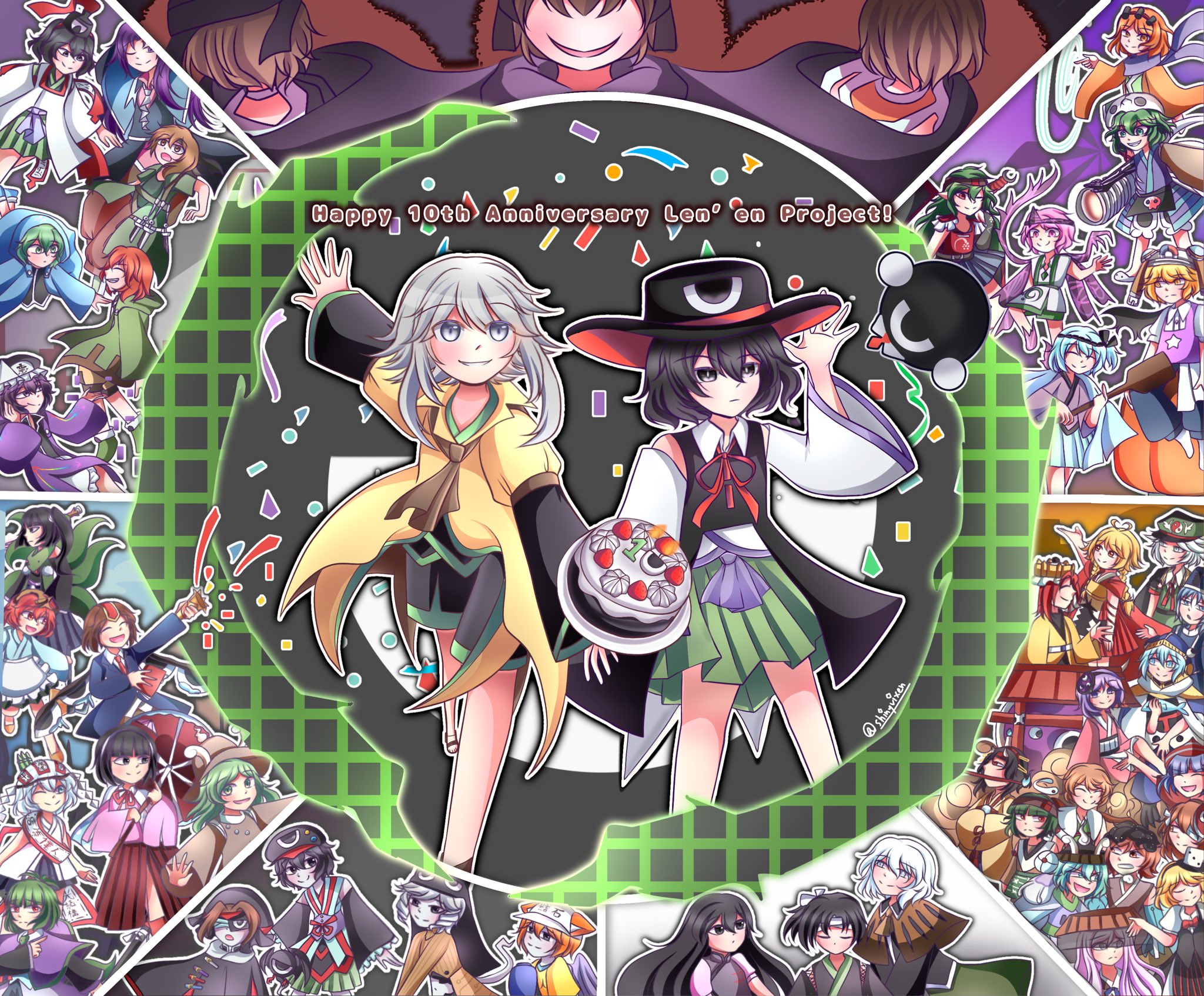 2girls 6+others absolutely_everyone adagumo_no_saragimaru adagumo_no_yaorochi ahoge ajirogasa amanomiya_jun amanomori_shou ametsukana_yago androgynous anniversary antennae arde_(len'en) armor azuma_kaisen benny_(len'en) black_hair blonde_hair bone bow braid breastplate bright_pupils brown_coat brown_hair cake cape capelet celeritas_lumen cine_hamal clause_(len'en) clone coat commentary confetti copyright_name crown detached_sleeves portal_(object) empty_eyes english_commentary enraku_tsubakura everyone extra_eyes food formal_clothes frilled_hat frills fujiwara_no_iyozane fujiwara_no_shirogane_no_sanra green_eyes green_hair grey_eyes grey_hair grin hair_ornament hairband hakama hakama_short_skirt hakama_skirt haru_(len'en) hat headband heart heart-shaped_pupils heart_ahoge highres holding holding_cake holding_food hood hooded_jacket hoodie houlen_yabusame jacket japanese_clothes jinbei_(len'en) kashiwagi_kaoru katano_sukune kesa_kujiru kitsugai_sese kokutenshi_hibaru kurohebi kuzu_suzumi len'en lin_(len'en) long_hair mirror mitsumo moritake_medias multiple_girls multiple_others necktie nilu_(len'en) ofuda ofuda_on_head ogata_garaiya one_eye_closed ooama_no_ake_no_mitori ooya_kunimitsu open_mouth orange_hair other_focus outline ponytail possessed red_ribbon rei_(len'en) ribbon right-over-left_kimono scarf senri_haiji senri_tsurubami shion_(len'en) shirami_souko shitodo_aoji shitodo_hooaka shitodo_hoojiro shitodo_kuroji short_hair short_hair_with_long_locks shorts siblings side_ponytail skirt skull-shaped_hat slit_pupils smile snake_tail source_request suit symbol-shaped_pupils tadpole_hat tadpole_tail tail taira_no_chouki taira_no_fumikado terumi_(len'en) tongue top_hat traditional_youkai triangular_headpiece turban umatachi_tsugumi v v-shaped_eyes very_long_hair weapon white_outline white_pupils wings xeno_a yukkyon_kyon zelo_(len'en) zemlja_c_tom zuifeng_tenkai