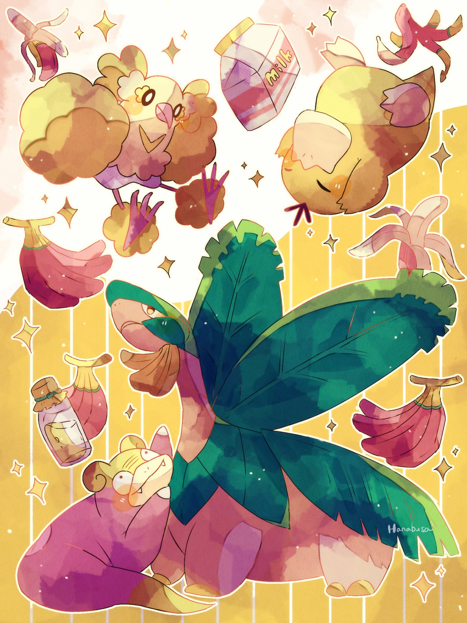 animal_focus artist_name banana banana_milk banana_peel bird colored_skin commentary_request food fruit gen_1_pokemon gen_3_pokemon gen_7_pokemon hanabusaoekaki highres leaf milk nintendo no_humans oricorio oricorio_(pom-pom) pink_skin pokemon pokemon_(creature) psyduck slowpoke solid_oval_eyes sparkle striped_background tropius upside-down wings yellow_background yellow_skin