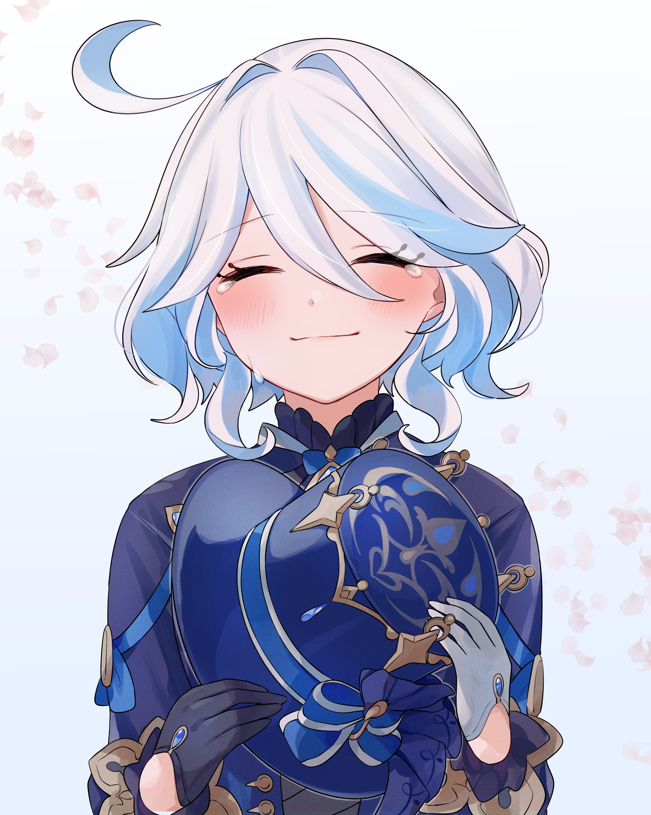 1girl ^_^ absurdres ahoge asymmetrical_gloves black_gloves blue_hair blue_hat blue_jacket closed_eyes commentary_request crying engasaki_sakura furina_(genshin_impact) genshin_impact gloves hair_intakes happy_tears hat highres holding holding_unworn_clothes holding_unworn_hat jacket long_sleeves mismatched_gloves multicolored_hair solo streaked_hair tears unworn_hat unworn_headwear upper_body white_gloves white_hair