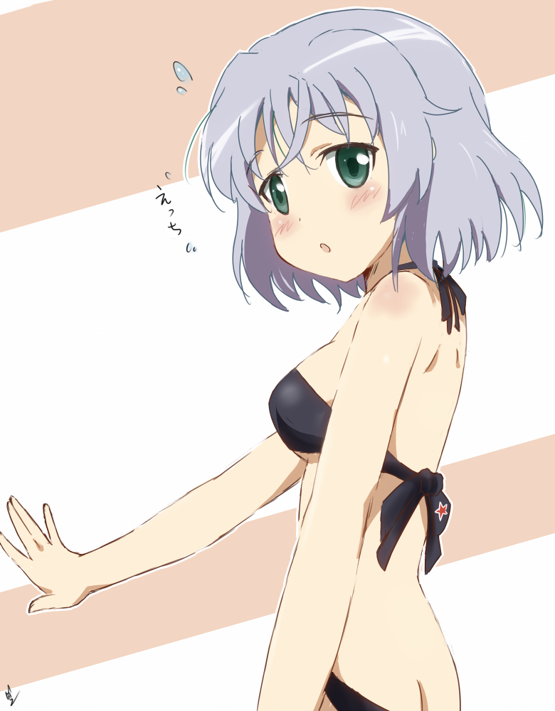 1girl ass bikini black_bikini blush butt_crack green_eyes grey_hair ma-2_(konkon_kitakitsune) open_mouth sanya_v._litvyak short_hair simple_background solo strike_witches strike_witches:_aurora_no_majo strike_witches:_suomus_misfits_squadron swimsuit world_witches_series