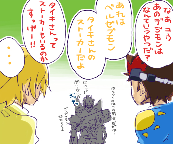 akashi_tagiru amano_yuu_(digimon) aonuma_kiriha beelzebumon_(digimon_xros_wars) belt digimon digimon_(creature) goggles goggles_on_head japanese_text kudou_taiki mask translation_request