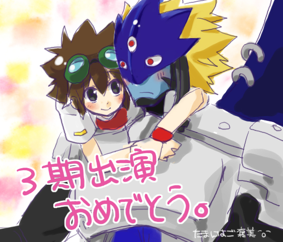 beelzebumon_(digimon_xros_wars) blonde_hair blush digimon digimon_(creature) japanese_text kudou_taiki mask translation_request wings