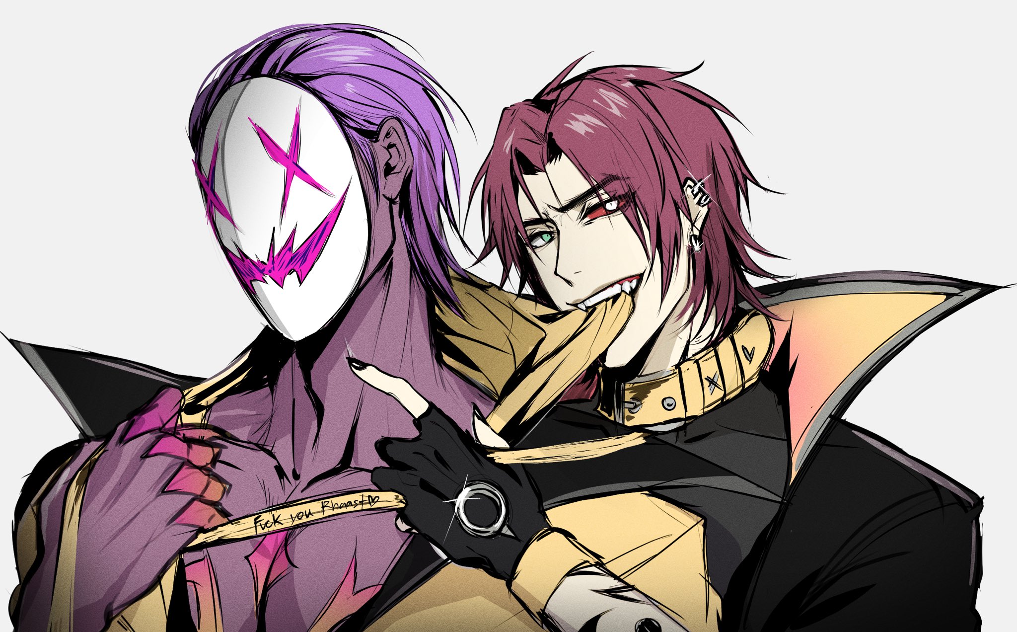 2boys belt_collar black_gloves black_jacket black_shirt collar colored_sclera colored_skin demon earrings fingernails gloves green_eyes heartsteel_kayn heartsteel_rhaast heterochromia highres jacket jewelry kayn_(league_of_legends) league_of_legends light_particles looking_at_viewer mask multiple_boys nail_polish official_alternate_costume official_alternate_hairstyle parted_bangs purple_hair purple_skin red_sclera rhaast shirt smile teeth upper_body white_eyes zyrophin