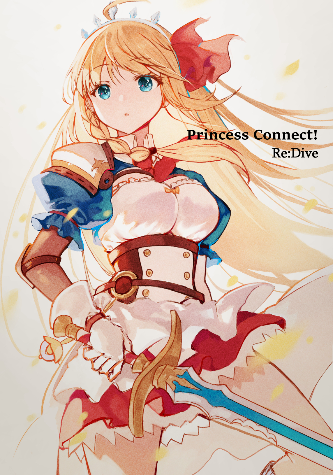 1girl ahoge ascot blue_eyes blue_sleeves braid corset dress gloves highres holding holding_sword holding_weapon kazumaru long_hair orange_hair pecorine_(princess_connect!) princess_connect! red_ascot red_ribbon ribbon side_braid solo standing sword tiara weapon