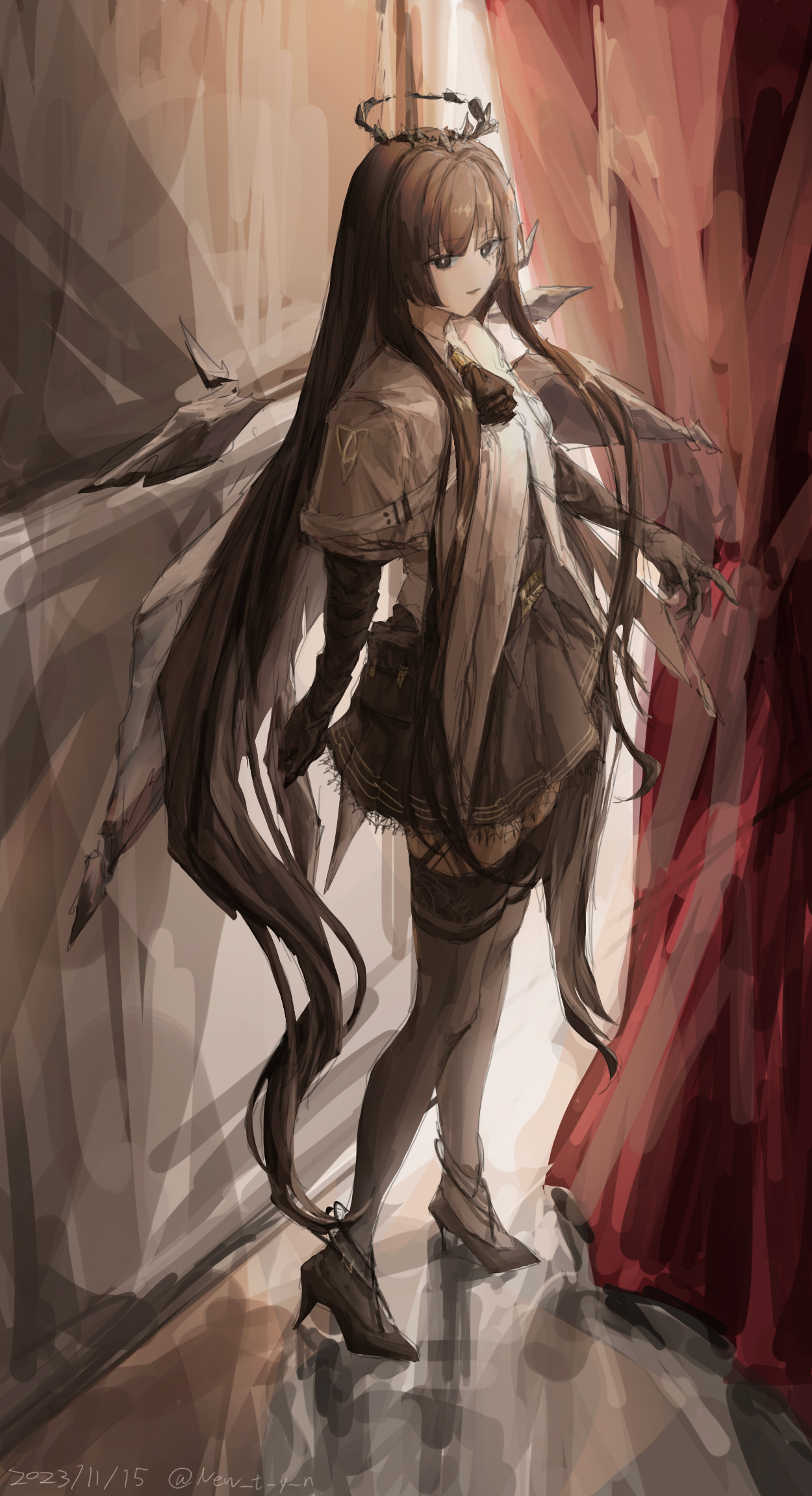 1girl arknights artist_name ascot backlighting belt belt_buckle belt_pouch black_belt black_collar black_eyes black_footwear black_garter_straps black_gloves black_hair black_halo black_shirt black_skirt black_thighhighs black_wings blunt_bangs breasts bright_pupils broken_halo buckle chinese_commentary collar collared_jacket colored_inner_hair commentary_request curtains dark_halo dated detached_wings energy_wings from_side full_body garter_straps gloves grey_hair halo high_heels highres hime_cut indoors jacket layered_sleeves light_smile lips long_hair long_sleeves miniskirt mole mole_under_eye multicolored_hair new_t_y_n pale_skin parted_lips pleated_skirt pouch shade shirt short-sleeved_jacket short_over_long_sleeves short_sleeves sidelocks silhouette skirt small_breasts solo standing strappy_heels thighhighs twitter_username two-tone_hair very_long_hair virtuosa_(arknights) white_belt white_jacket white_pupils wide_sleeves wing_collar wings zettai_ryouiki