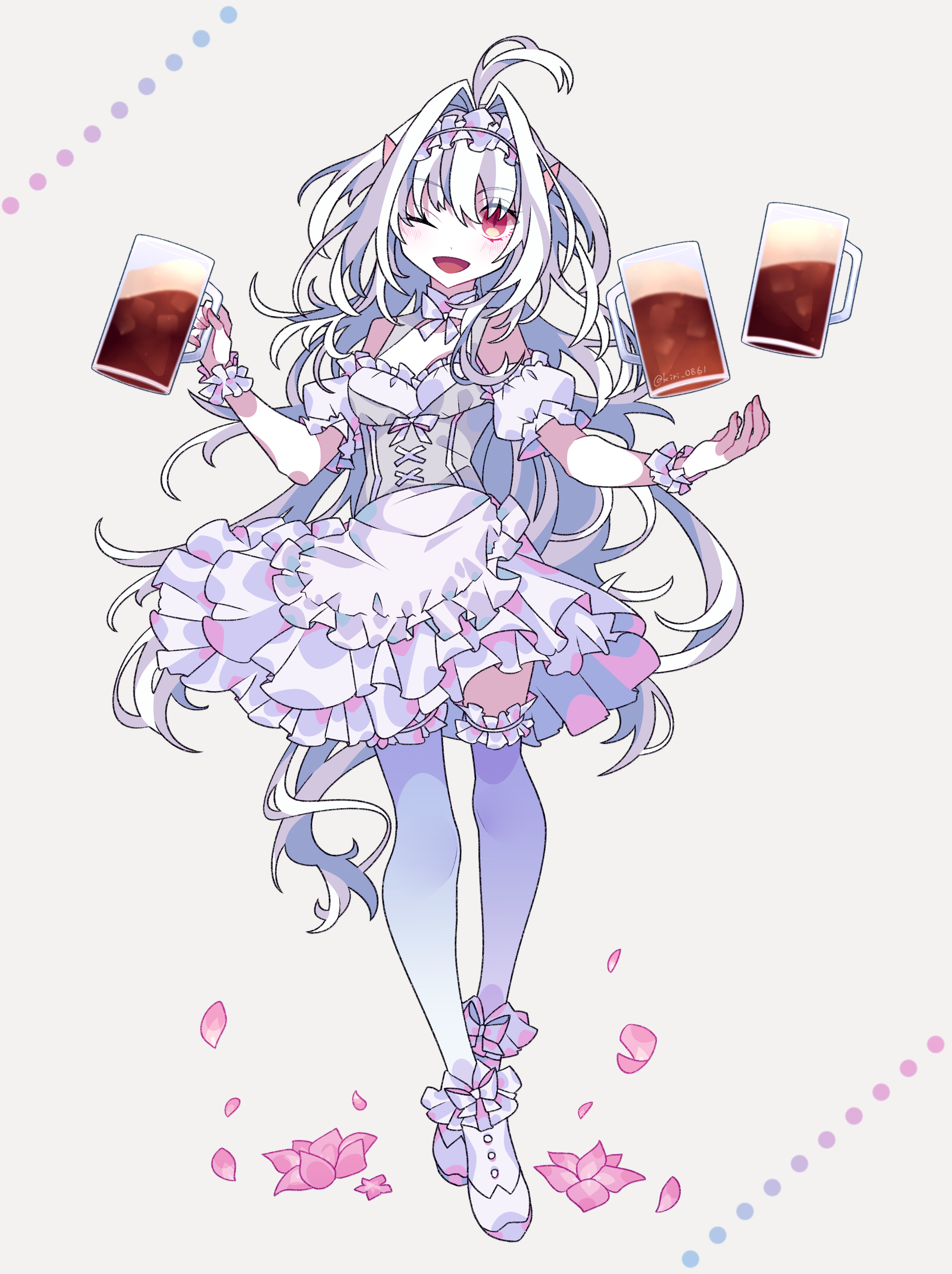 1girl absurdres ahoge alcohol beer beer_mug breasts cup fate/grand_order fate_(series) flower highres kujiramaru lady_avalon_(event_portrait)_(fate) lady_avalon_(fate) long_hair maid medium_breasts merlin_(fate/prototype) mug one_eye_closed open_mouth pink_eyes pink_flower simple_background thighhighs white_hair white_thighhighs