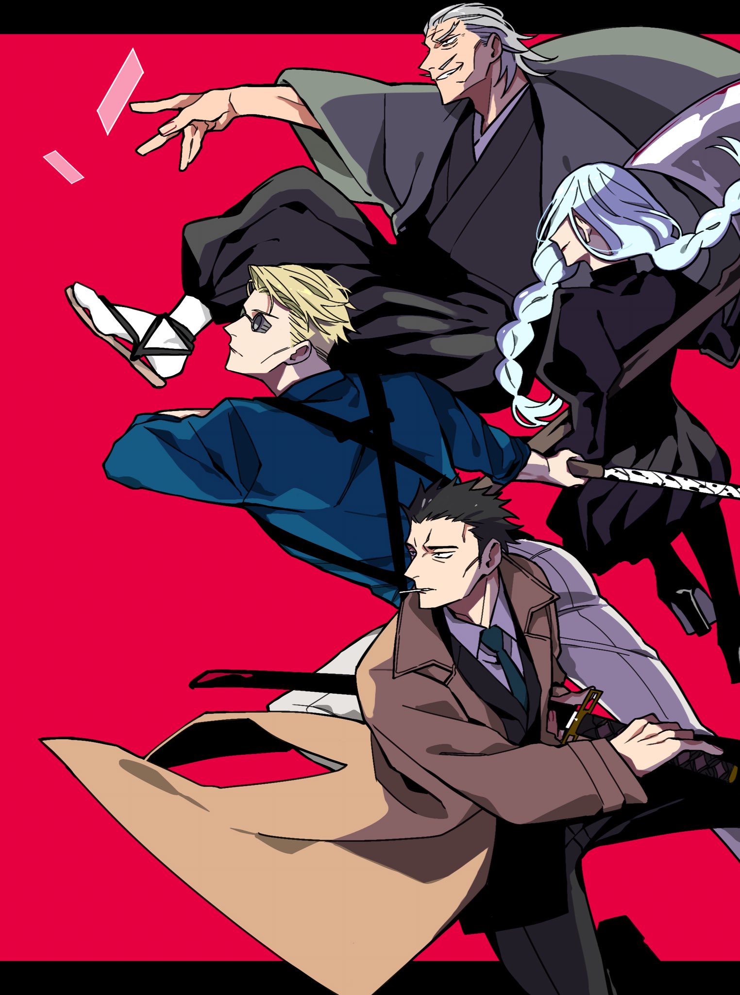 1girl 3boys axe black_dress black_hair black_kimono black_necktie black_pants black_vest blonde_hair blue_shirt braid brown_coat closed_mouth coat collared_shirt dress facial_hair goggles grey_hair grin hakama hakama_pants haori highres holding holding_axe holding_sword holding_weapon japanese_clothes jujutsu_kaisen katana kimono kusakabe_atsuya long_sleeves mei_mei_(jujutsu_kaisen) mochiya_(mochiya0504) mouth_hold multiple_boys mustache nanami_kento necktie pants profile red_background round_eyewear sandals scabbard sheath shirt smile socks suspenders sword toothpick twin_braids vest weapon white_pants white_shirt white_socks wide_sleeves zen'in_naobito