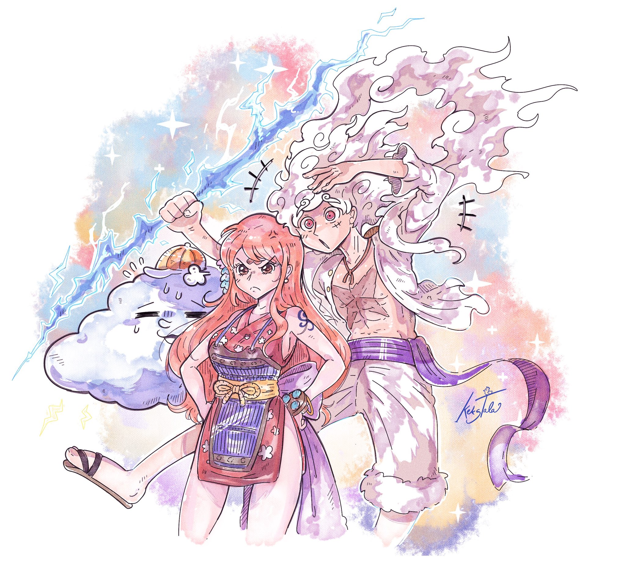 1boy 1girl 1other :< :o bandaid bandaid_on_face bare_arms bare_legs bare_shoulders breasts curvy denim feeding fiery_hair floating floral_print floral_print_kimono gear_fifth hands_on_own_hips hat highres japanese_clothes kekstala kimono large_breasts lightning log_pose long_hair monkey_d._luffy nami_(one_piece) nami_(one_piece)_(onigashima) official_alternate_costume one_piece open_clothes open_shirt orange_eyes orange_hair print_kimono red_kimono sandals scar scar_across_eye scar_on_chest scar_on_face serious shiny_skin shirt short_hair short_kimono shoulder_tattoo sleeveless sleeveless_kimono sweat tattoo very_long_hair white_background wide_hips zeus_(one_piece)