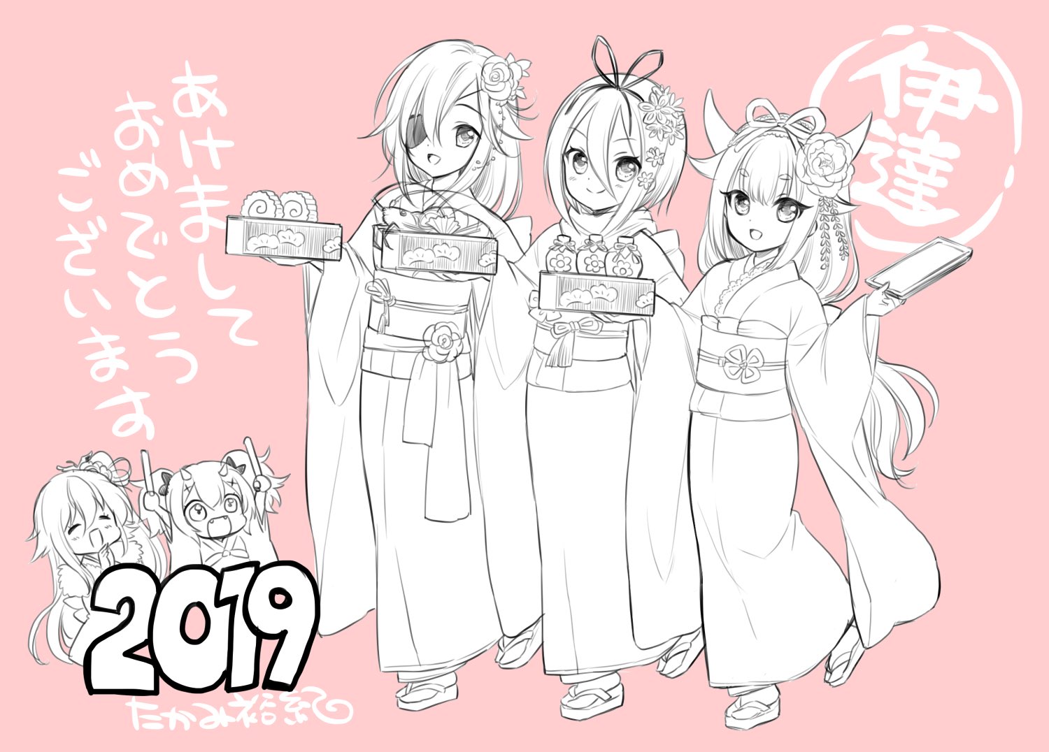 2019 4girls arm_up artist_name bento bow chibi closed_eyes closed_mouth commentary_request cow_horns datemaki_(food) drumsticks eyelashes eyepatch fake_horns flower goou_yoshimitsu greyscale_with_colored_background hair_bow hair_flaps hair_flower hair_ornament happy_new_year holding holding_bento horns japanese_clothes kimono lobster long_hair long_sleeves low_ponytail multiple_girls new_year obi obiage obijime one_side_up oni_horns ookurikara_(tenka_hyakken) open_mouth osechi own_hands_together pink_background ponytail sandals sash shokudaikiri_mitsutada_(tenka_hyakken) short_hair smile standing standing_on_one_leg taikokane_sadamune takami_yuuki tenka_hyakken tsurumaru_kuninaga_(tenka_hyakken) twintails wide_sleeves zouri