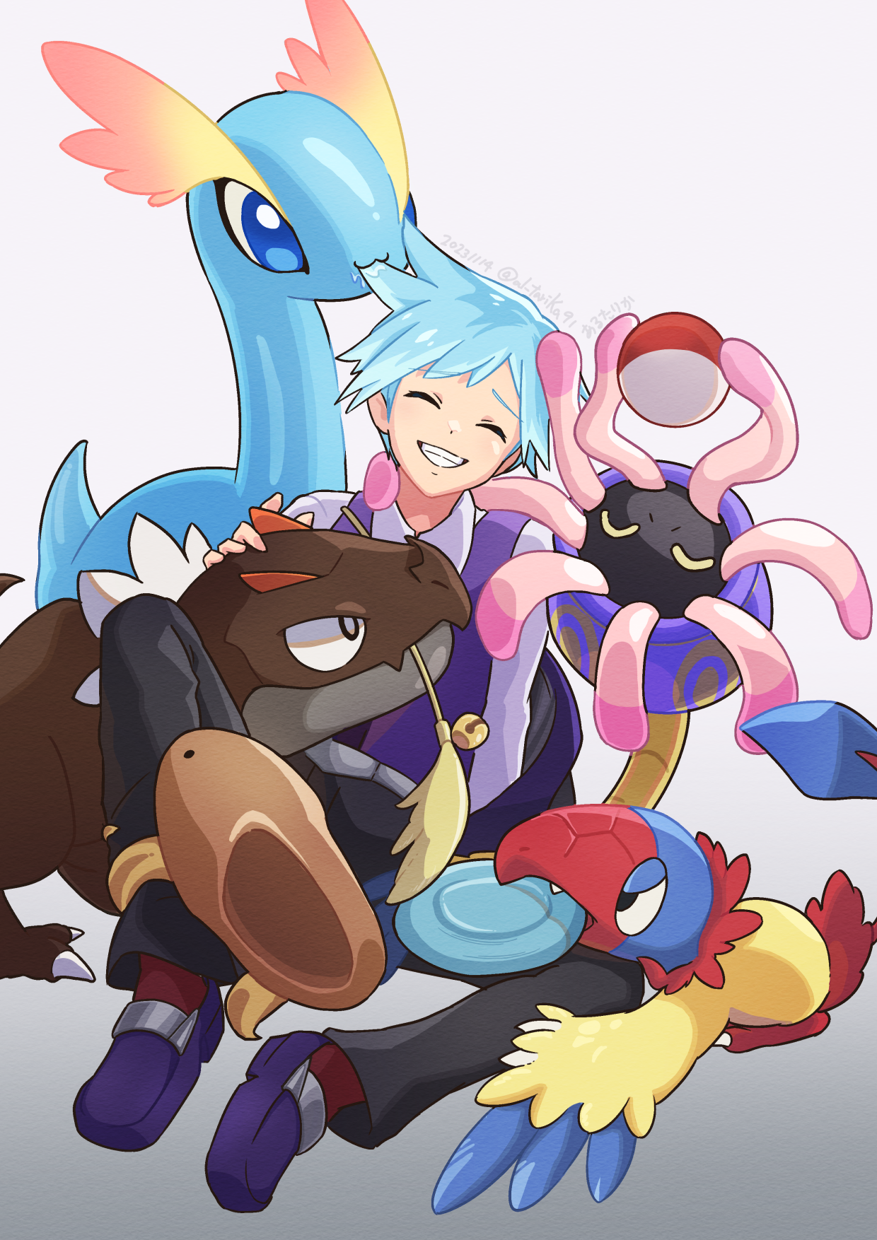 1boy amaura archen arutarika_(ri_kaoekaki) black_pants blue_hair closed_eyes collared_shirt commentary_request eating_hair gen_3_pokemon gen_5_pokemon gen_6_pokemon gradient_background grin happy highres lileep male_focus nibbling nintendo pants pokemon pokemon_(creature) pokemon_omega_ruby_and_alpha_sapphire purple_footwear purple_vest red_socks shirt shoes short_hair smile socks steven_stone teeth twitter_username tyrunt vest white_shirt