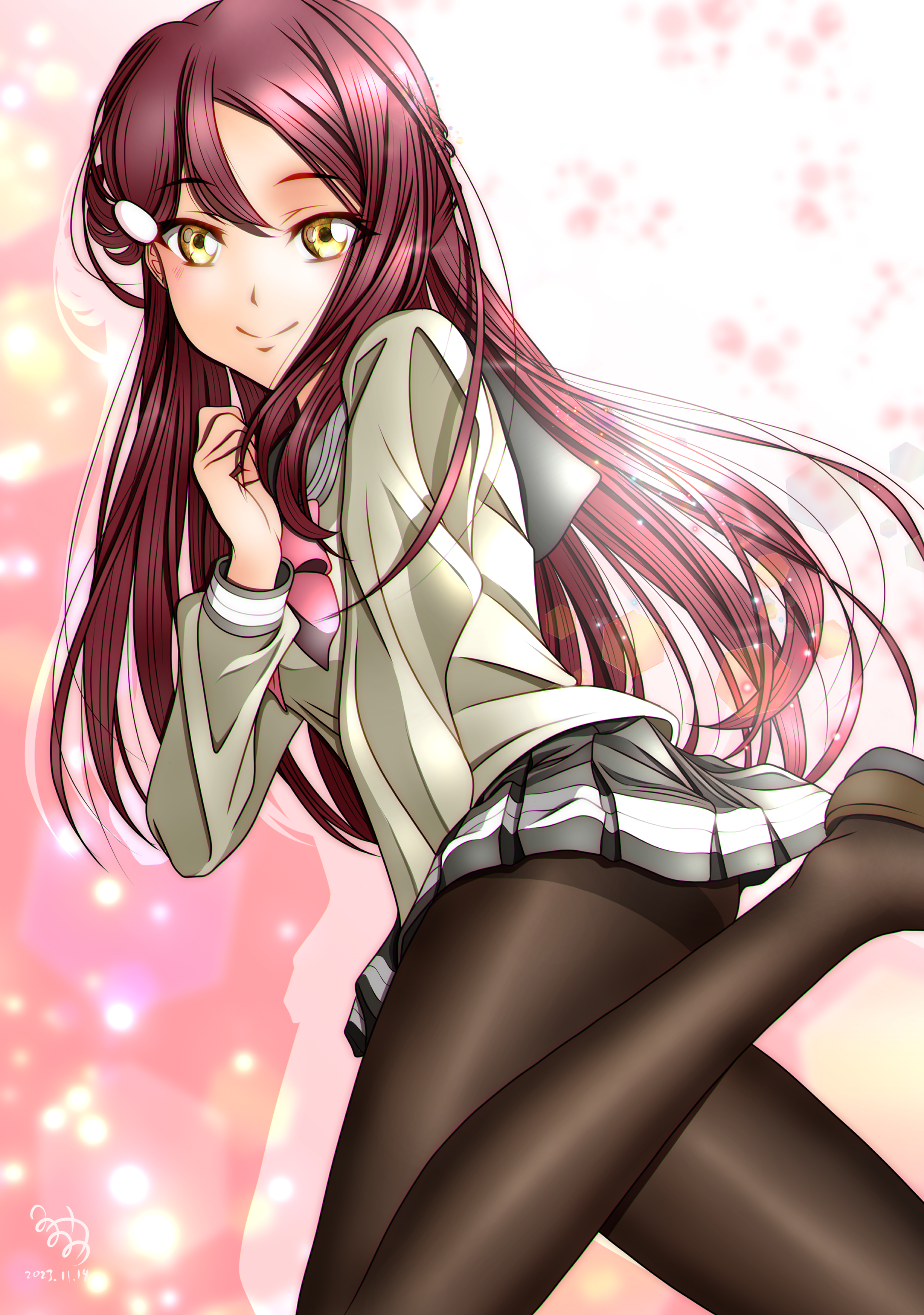 1girl absurdres highres long_hair long_sleeves looking_at_viewer love_live! love_live!_sunshine!! minami_saan red_hair sakurauchi_riko smile solo uranohoshi_school_uniform yellow_eyes