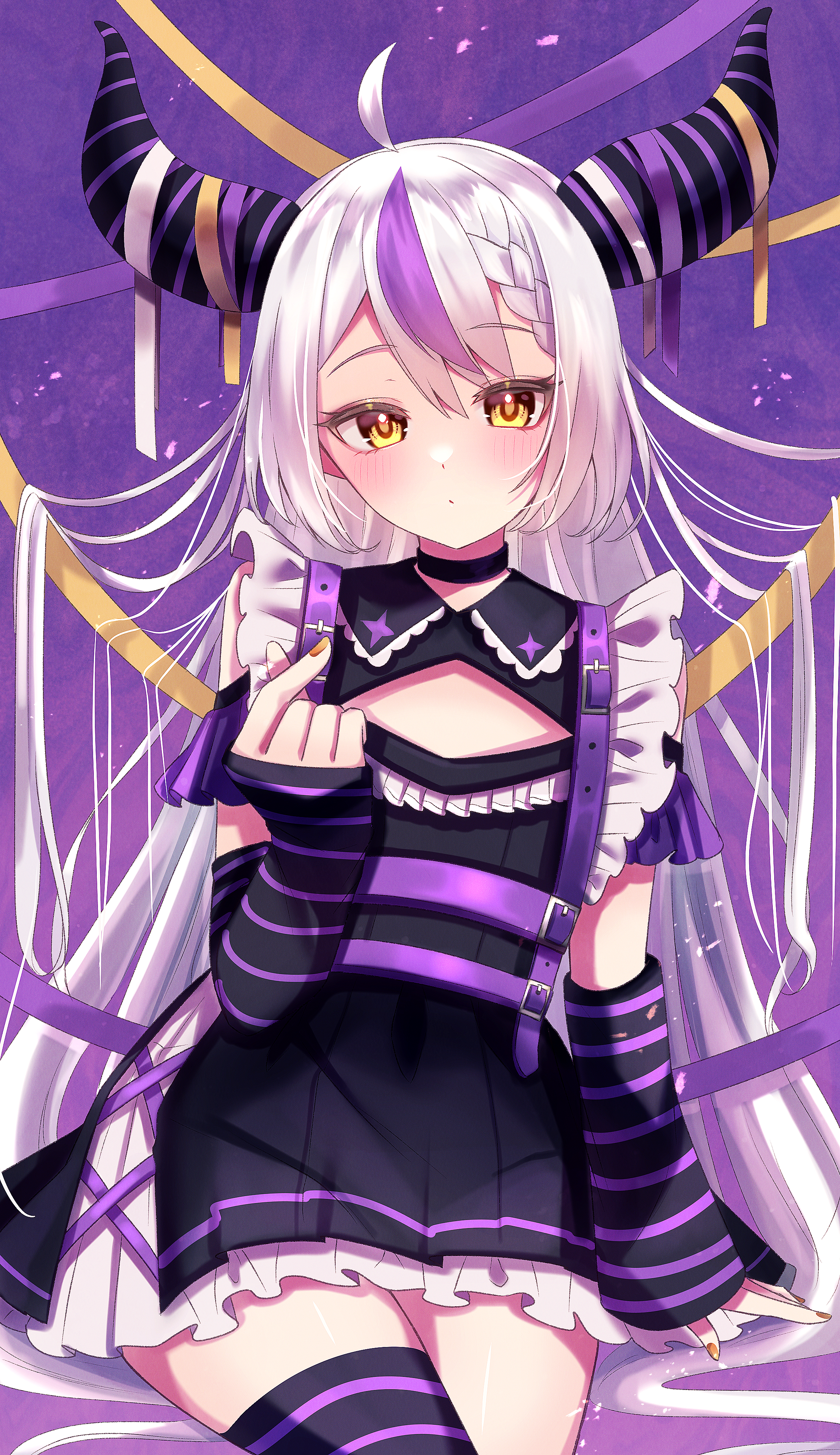 1girl absurdres ahoge black_horns braid braided_bangs choker clothing_cutout detached_sleeves finger_heart grey_hair highres hololive horns jirai_kei junineu la+_darknesss multicolored_hair pointy_ears single_thighhigh streaked_hair striped_clothes striped_horns striped_thighhighs thighhighs virtual_youtuber yellow_eyes