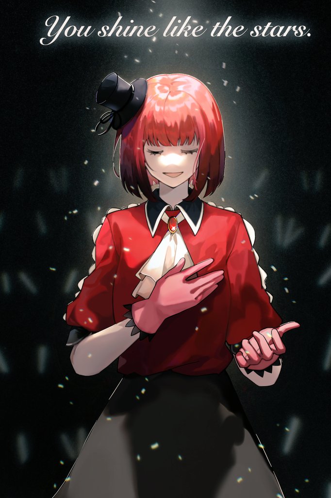 1girl arima_kana black_background black_headwear black_skirt bob_cut closed_eyes dress gloves hat hat_ribbon idol idol_clothes inverted_bob open_mouth oshi_no_ko pink_gloves plum_(redlittleplum1) red_hair red_shirt ribbon shirt short_hair skirt smile