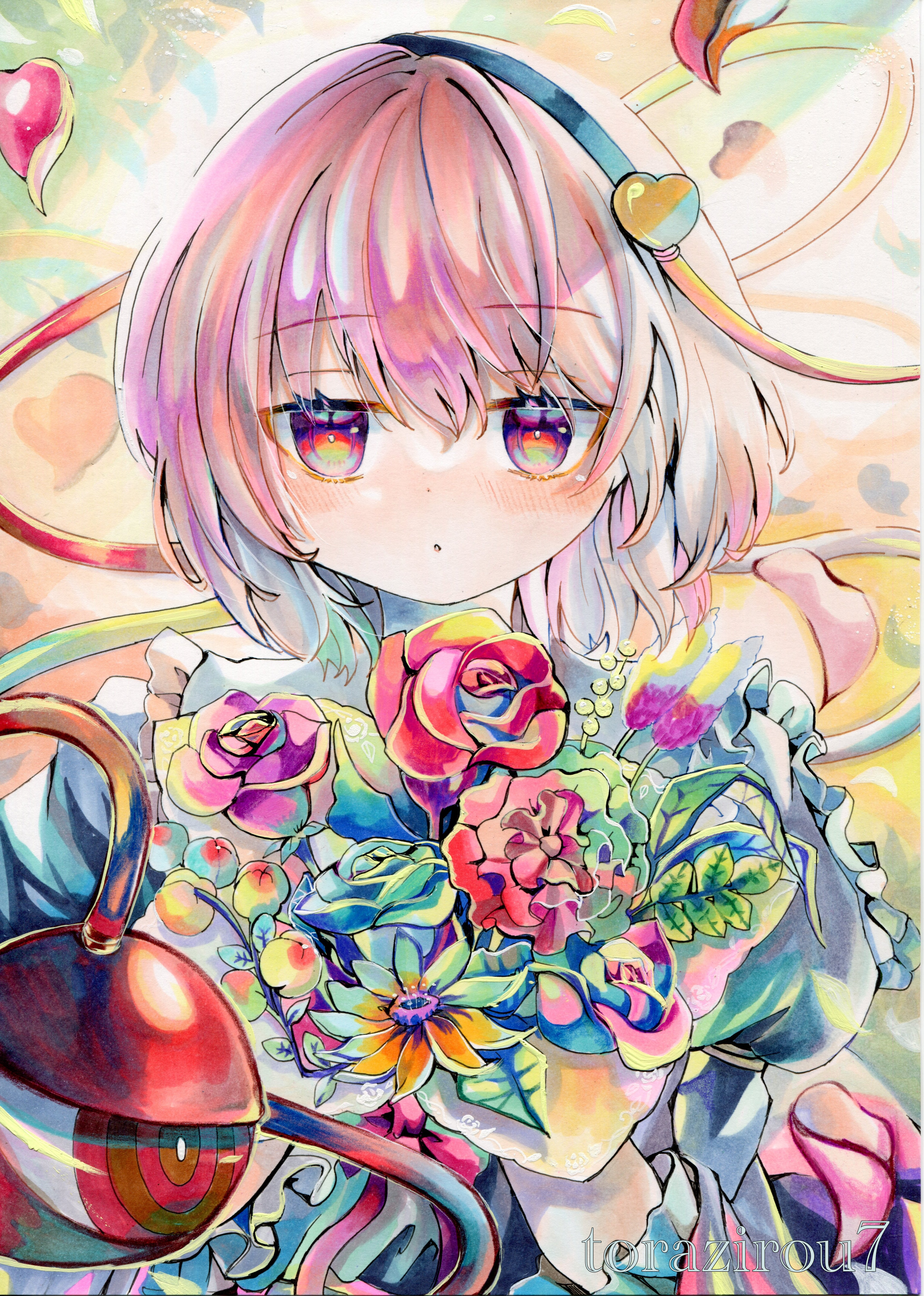 1girl :o absurdres artist_name blue_dress blush bouquet dress falling_petals flower frilled_dress frills hairband heart highres holding holding_bouquet jitome komeiji_satori long_sleeves looking_at_viewer petals pink_eyes pink_hair short_hair solo straight-on third_eye torajirou_(toraneko_zirou) touhou traditional_media