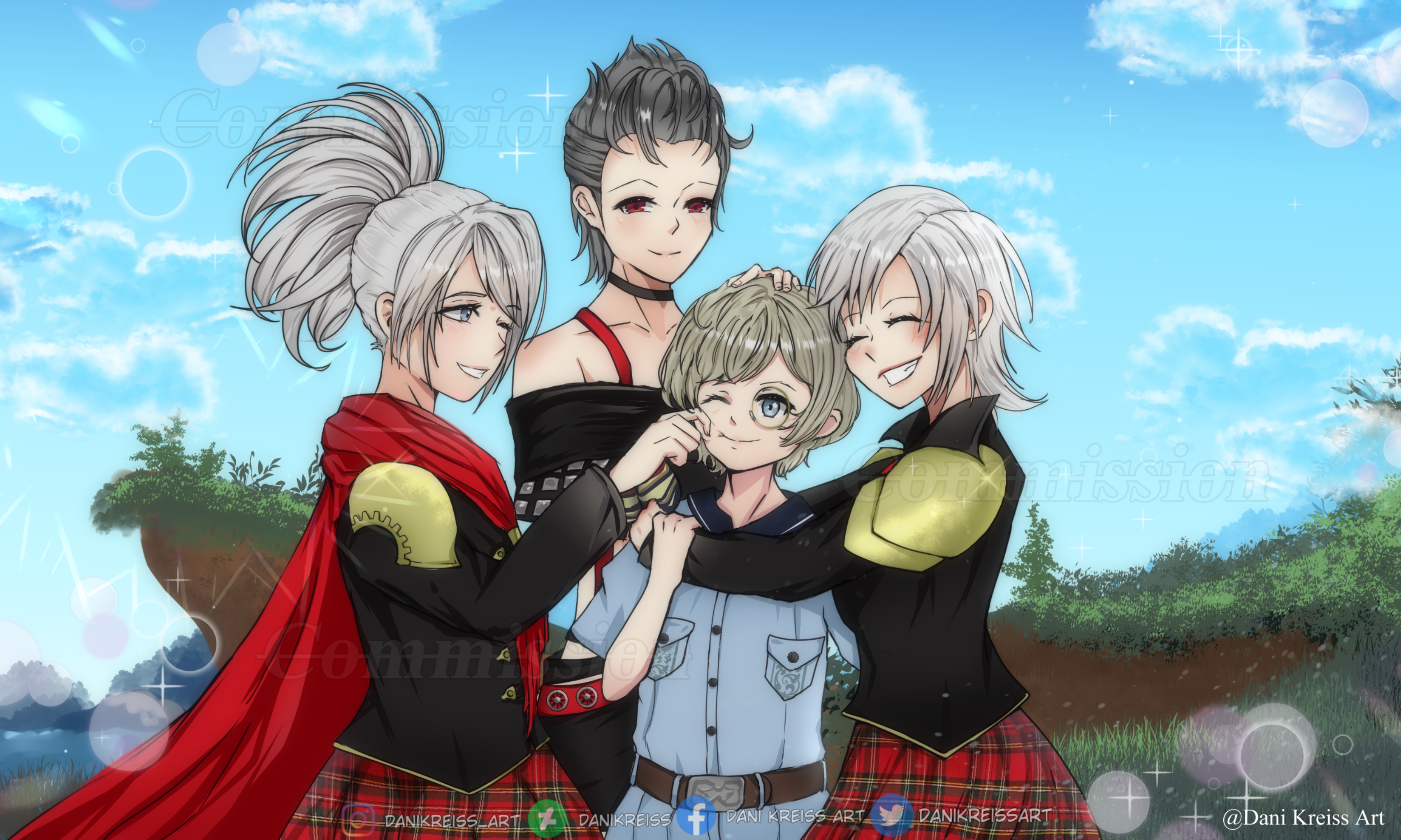 1boy 3girls absurdres chadley_(ff7) crossover final_fantasy final_fantasy_type-0 final_fantasy_vii final_fantasy_vii_remake final_fantasy_x harem highres multiple_girls paine_(ff10) seven_(fft-0) sice_(fft-0) square_enix